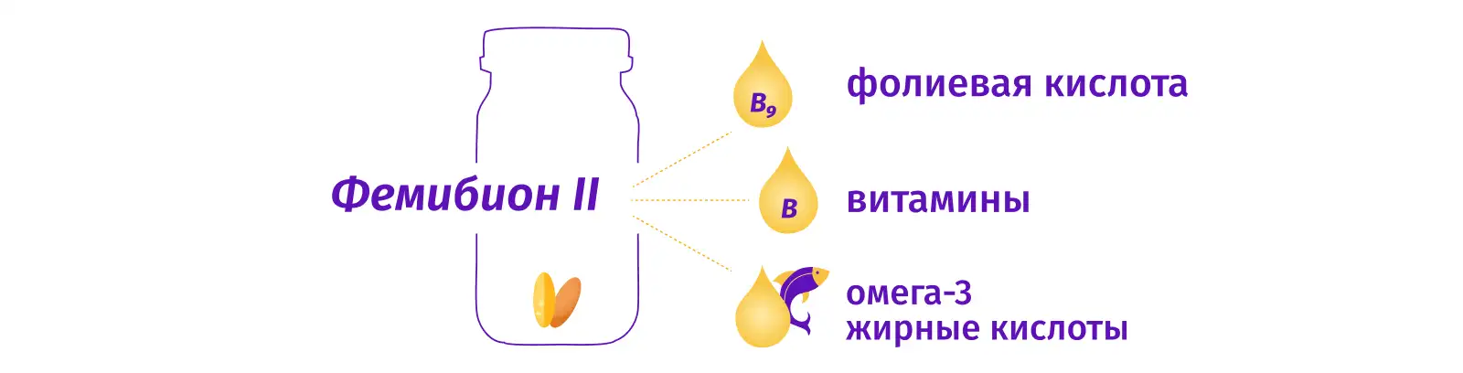 Одним из источников омега-3 для беременных может быть препарат Фемибион II, который рекомендуется с 13 недели беременности⁹.