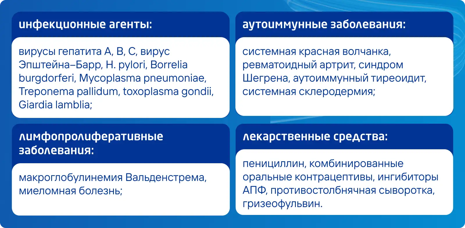 Холодовая крапивница может быть связана с рядом инфекционных, аутоиммунных и системных заболеваний, а также воздействием лекарственных средств [3]: