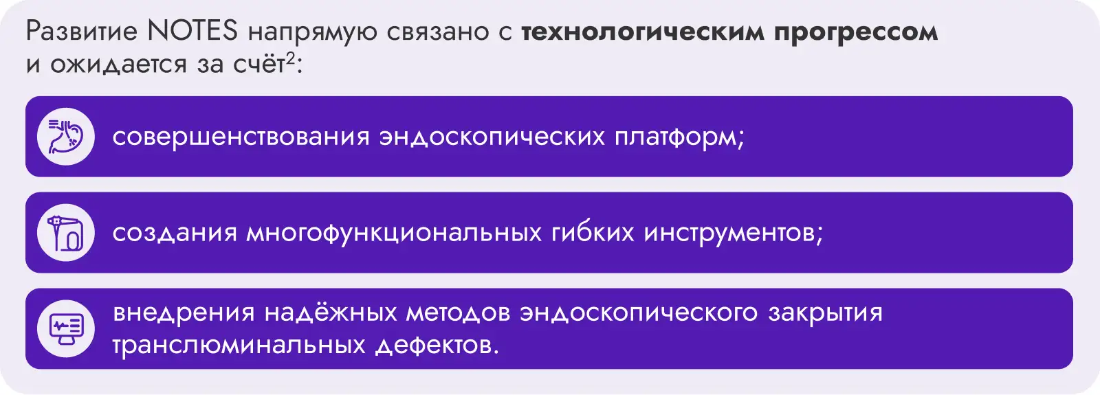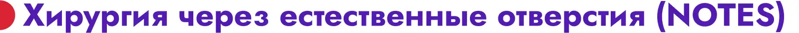 Одним из наиболее радикальных направлений развития МИХ, ориентированным на дальнейшее сокращение операционной травмы, стала хирургия через естественные отверстия (Natural Orifice Translumenal Endoscopic Surgery – NOTES) [2]. В рамках этого подхода минимизация инвазивности достигается путём полного отказа от кожных разрезов как таковых [2].