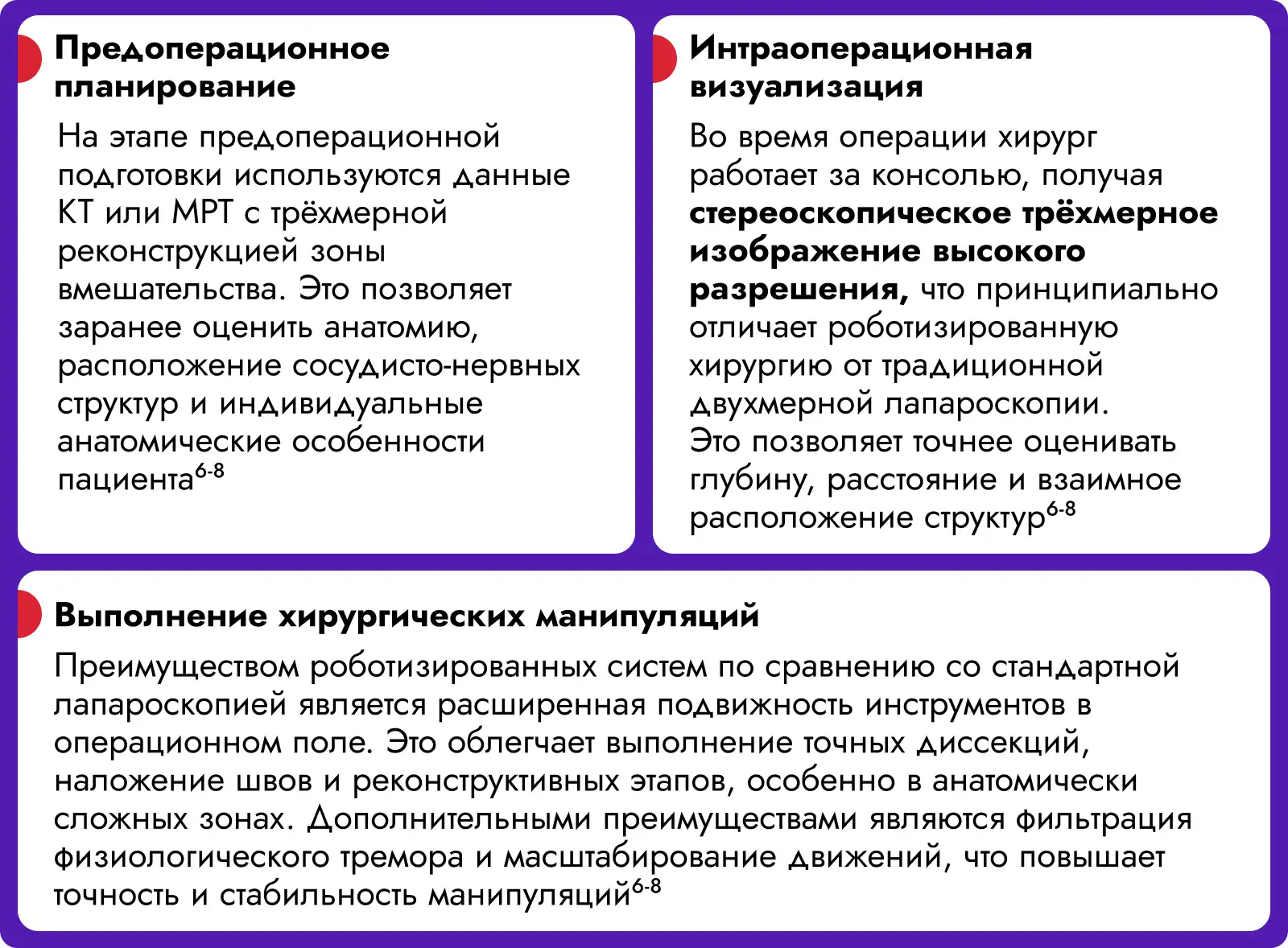 Принципиально важно, что робот не выполняет операцию автономно, а воспроизводит движения хирурга с повышенной точностью, стабильностью и расширенными техническими возможностями.
