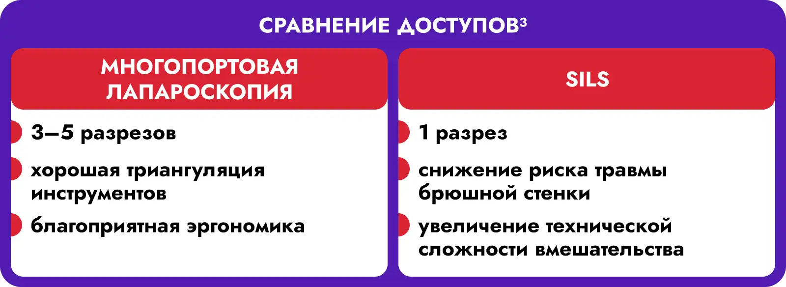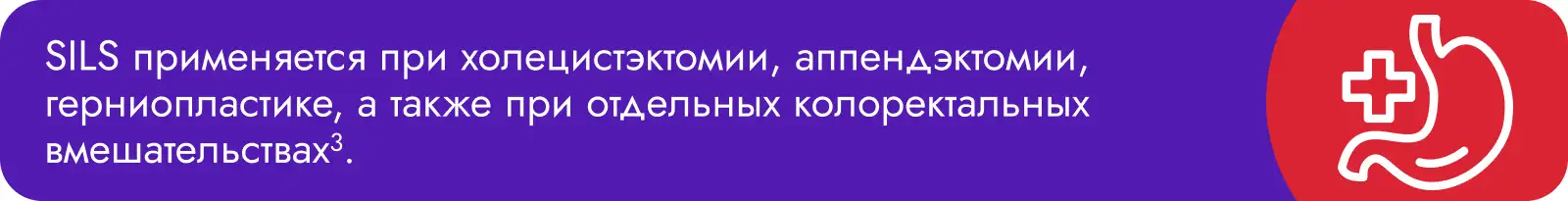 Несмотря на перспективность NOTES, его широкое внедрение в клиническую практику в настоящее время остаётся ограниченным. В этой связи интерес представляет однопортовая лапароскопическая хирургия (SILS) [3].