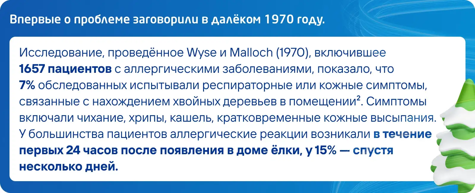 2. Wyse D.M., Malloch D. Christmas tree allergy: mould and pollen studies // Canadian Medical Association Journal. — 1970. — Vol. 103, № 12. — P. 1272–1276.