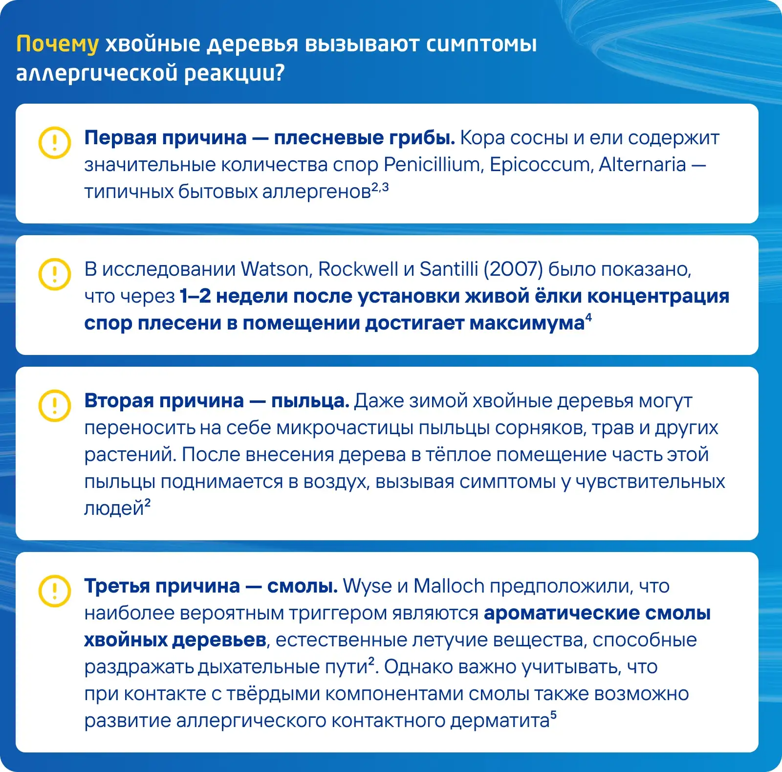 Праздничный сезон традиционно ассоциируется с уютом, ароматом хвои, гирляндами и тёплой атмосферой. Однако именно в это время года у многих людей могут усиливаться или впервые появляться симптомы аллергии. В зарубежной медицинской литературе это явление получило название «синдром рождественской ёлки» (Christmas Tree Syndrome) [1].