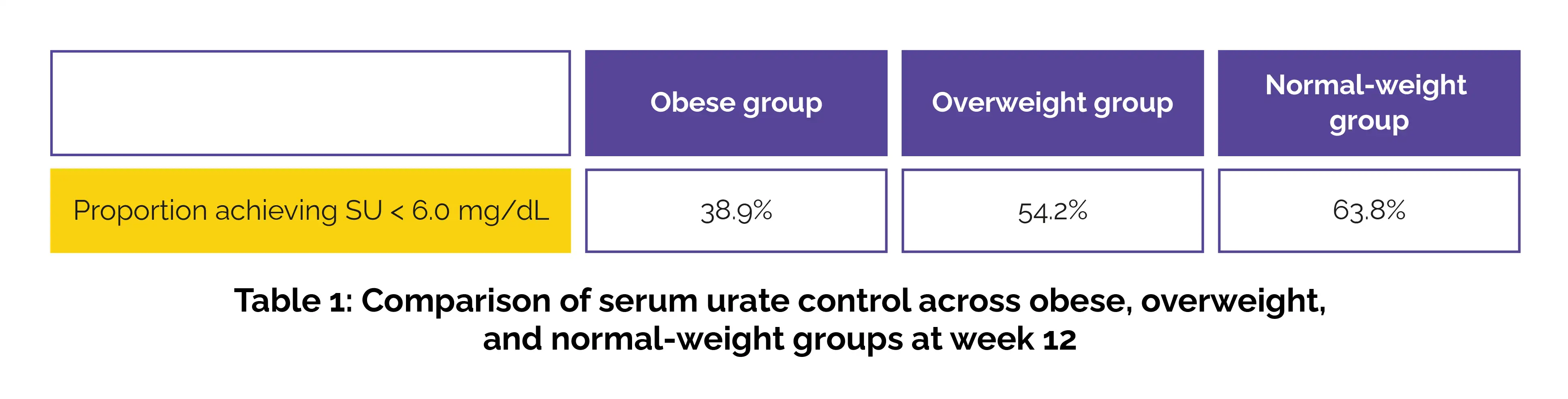 To ensure comparability, volunteers across the three BMI groups were matched for baseline age, gout duration, and initial SU levels. All individuals received febuxostat over a 12-week period, with the daily dose titrated from 20 mg to 40 mg. Researchers examined the proportion of patients reaching the target SU level of less than 6.0 mg/dl and monitored the incidence of gout flares. The proportion of volunteers achieving SU < 6.0 mg/dl in the obese group was quite lower than the overweight and normal-weight groups, with no prominent difference between the overweight and normal-weight groups at week 12 (Table 1):