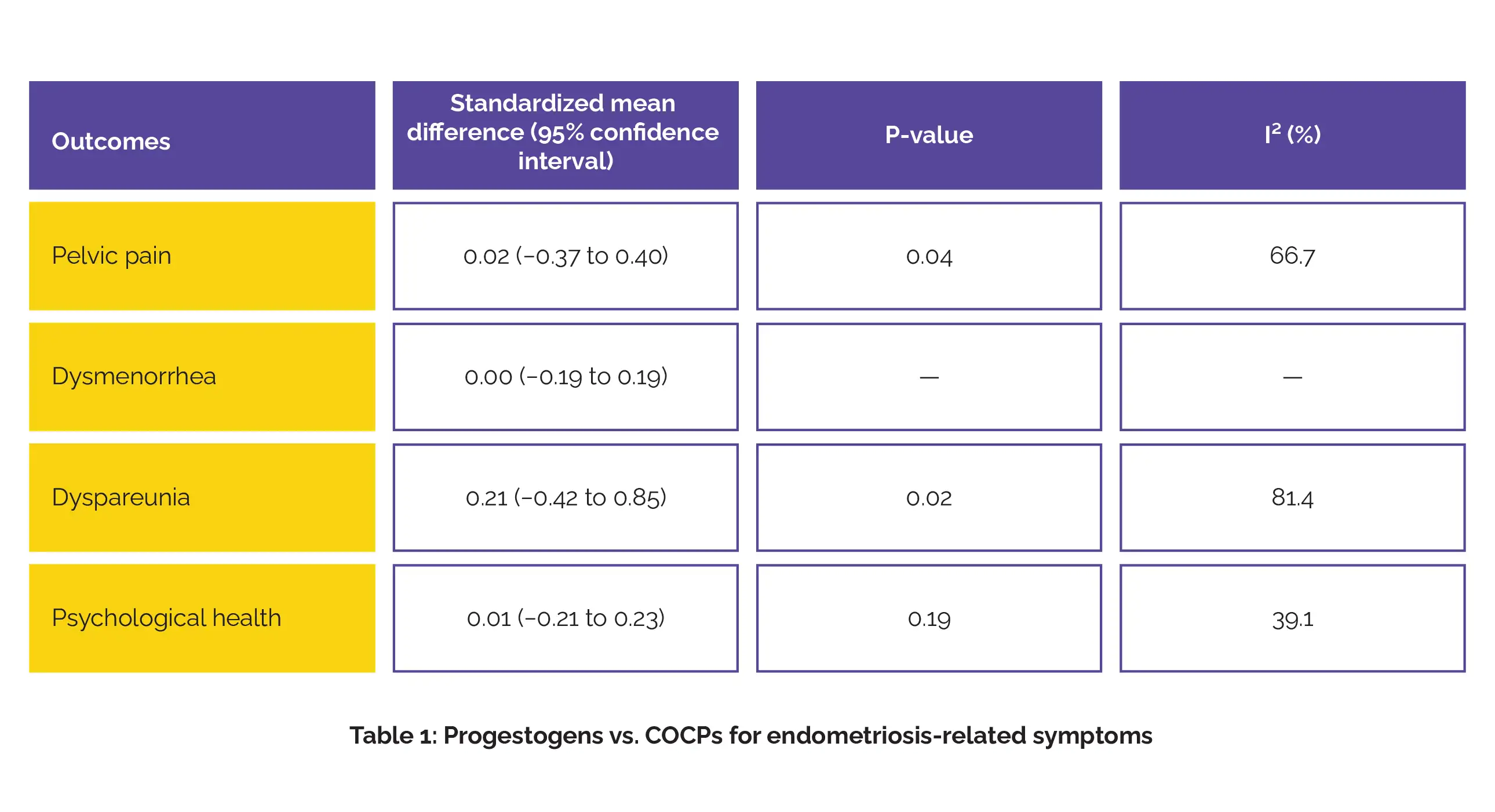 Researchers scoured major databases, including Cochrane Central Register of Controlled Trials, Embase, and PubMed. Only studies directly comparing progestogens and COCPs for endometriosis-related pain were included. Abstracts, case reports, opinion pieces, and studies without meaningful results were eliminated. No prominent differences were reported between progestogens and COCPs in mitigating pelvic pain, dysmenorrhea, dyspareunia, or psychological health (Table 1).