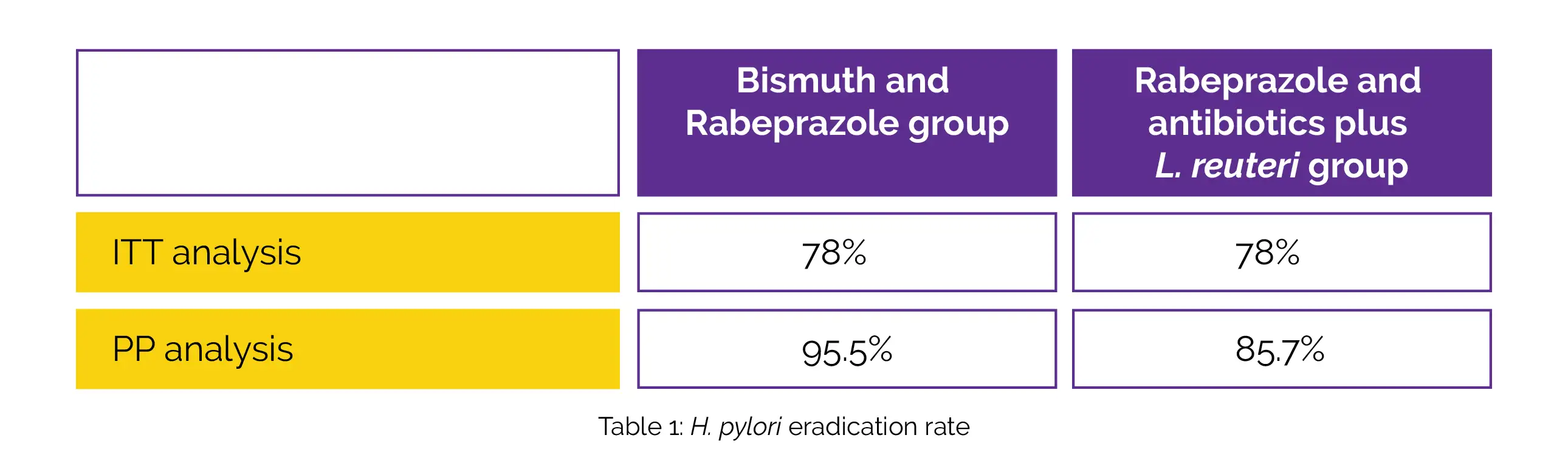 In both groups, the H. pylori elimination rate according to intention-to-treat (ITT) analysis and per protocol (PP) analysis is illustrated in Table 1: