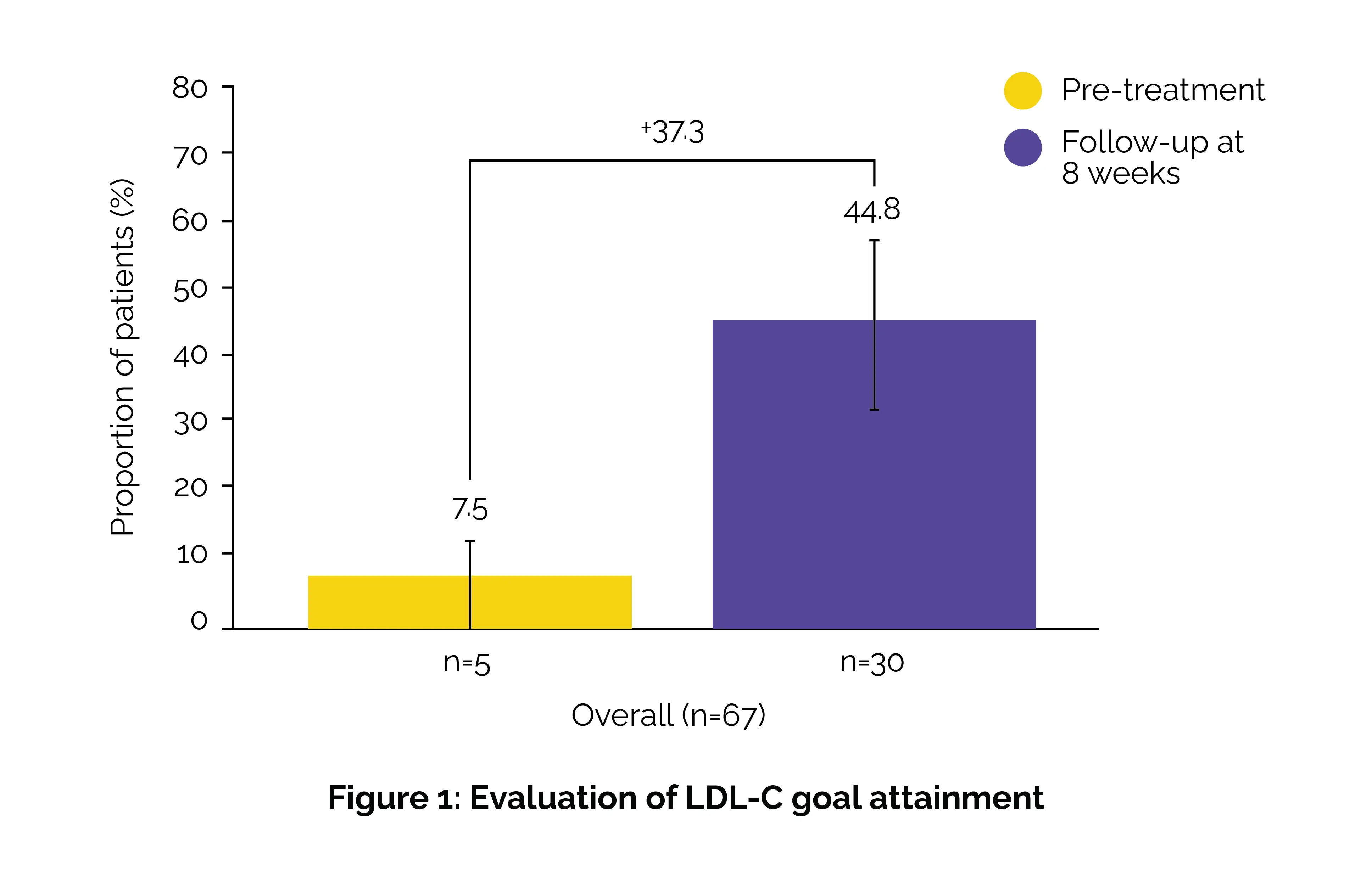 After an average treatment duration of 69 days, patients illustrated a mean LDL-C reduction of nearly 30%, dropping from 3.6 mmol/L to 2.4 mmol/L following BA or BA+EZE FDC therapy, with or without additional LLTs. The percentage of patients attaining LDL-C target levels escalated more than 6-fold — from 7.5% at baseline to 44.8% at 8 weeks (Figure1).