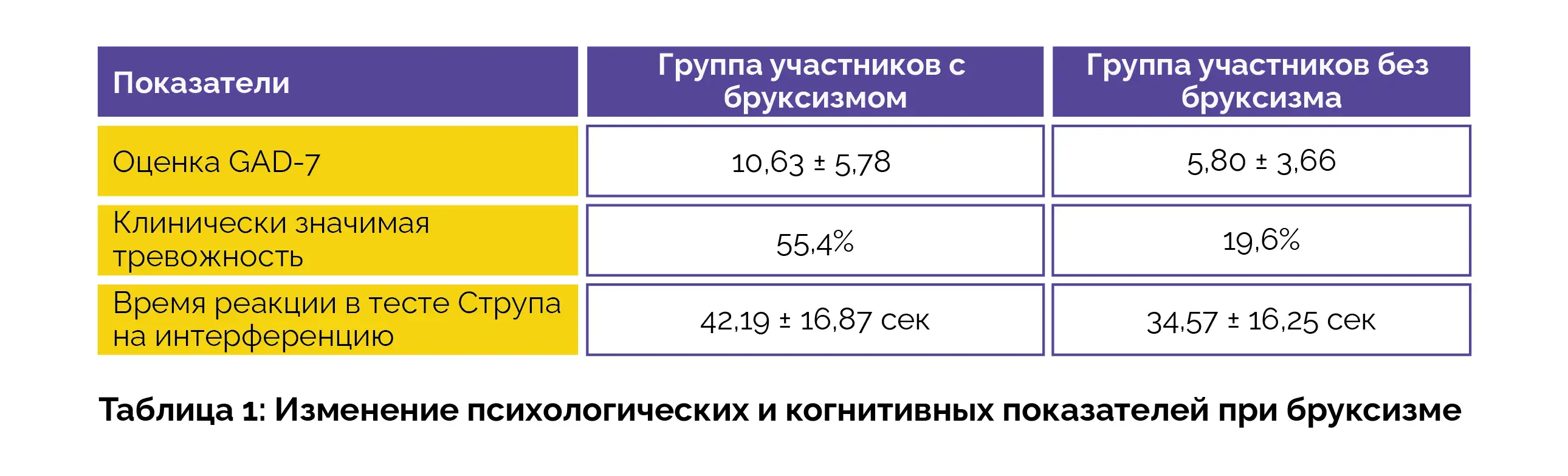 Бруксизм тесно связан с повышенной тревожностью, неадаптивными копинг-стратегиями и замедленным когнитивным торможением, что подчеркивает его роль как сложного биопсихосоциального расстройства.