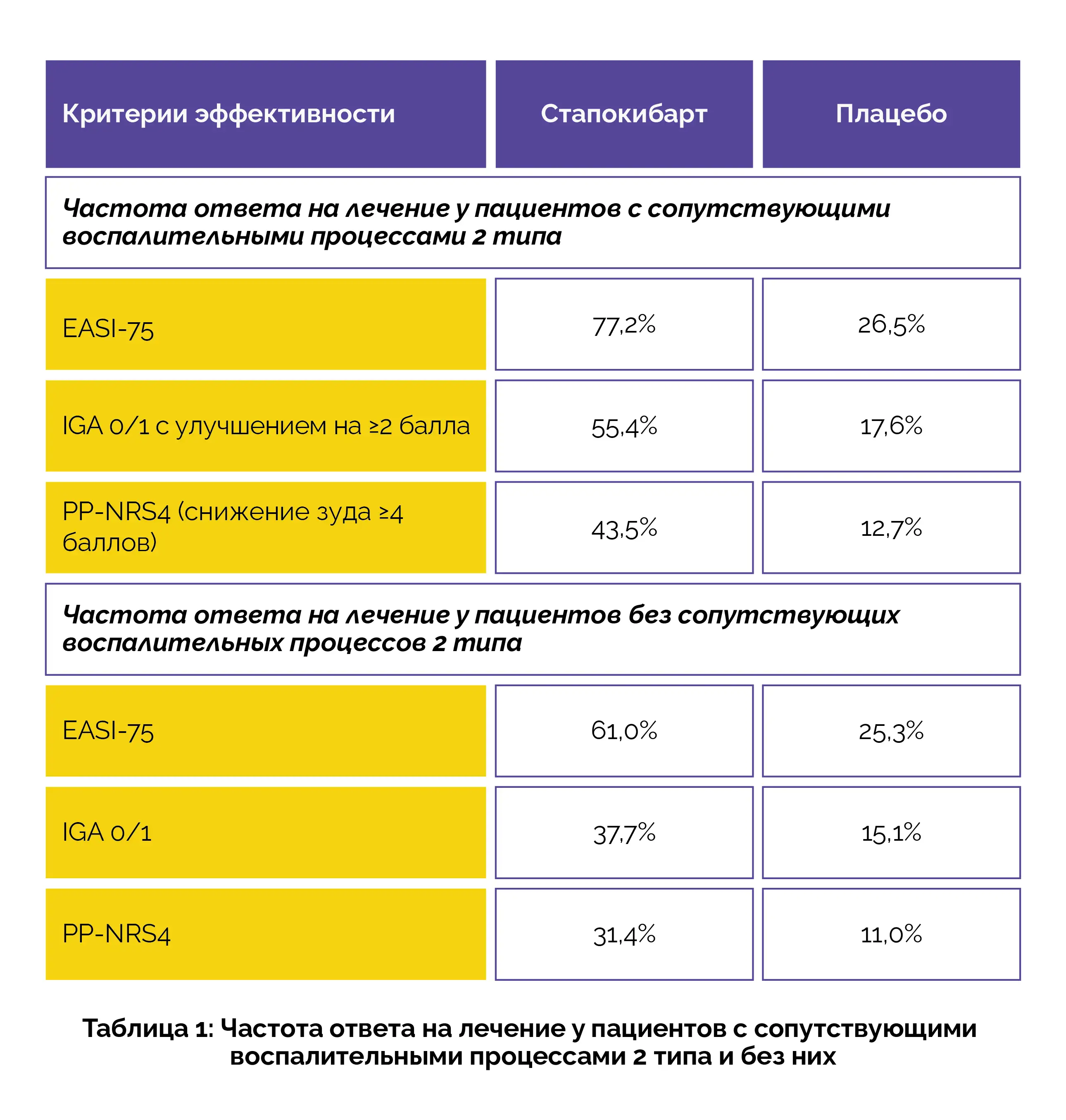 Исходные демографические данные и показатели тяжести заболевания были сопоставимы между группами. На 16-й неделе стапокибарт продемонстрировал статистически значимое превосходство над плацебо по всем измеренным показателям (таблица 1).