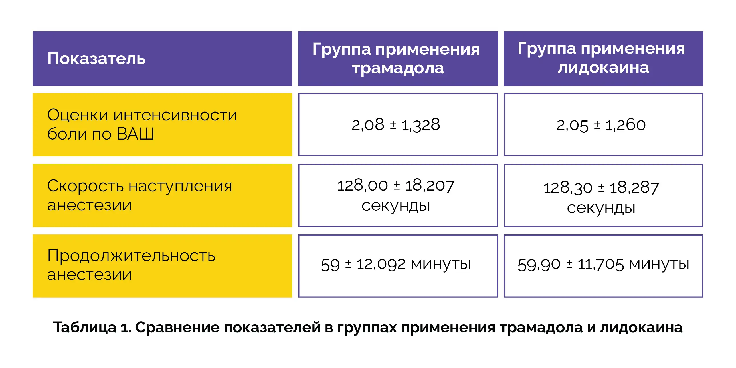 Включенным в исследование добровольцам вводили 5 % раствор трамадола гидрохлорида в сочетании с адреналином или 2 % раствор лидокаина гидрохлорида в сочетании с адреналином путем супрапериостальной инфильтрации. Исследователи регистрировали оценки интенсивности боли по визуальной аналоговой шкале (ВАШ), скорость наступления и продолжительность анестезии, а также частоту развития нежелательных явлений. Существенных различий в оценках по ВАШ, скорости наступления и продолжительности анестезии выявлено не было (см. таблицу 1).