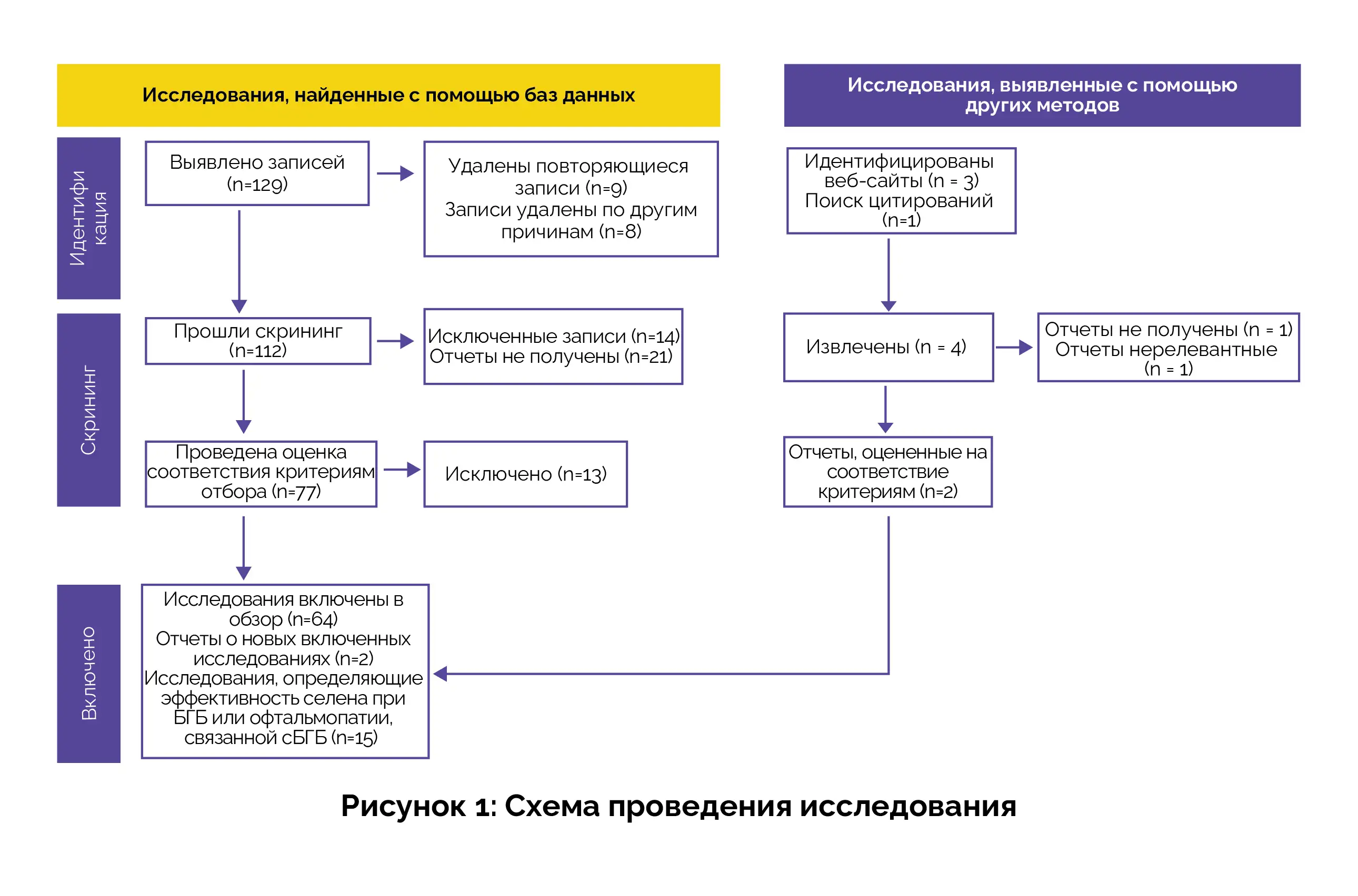 Исследование было проведено в соответствии с рекомендациями PRISMA (Предпочтительные параметры отчётности для систематических обзоров и метаанализа) и модифицированной версией модели PICO (Популяция, Интервенция, Сравнение, Исходы) (Рисунок 1).