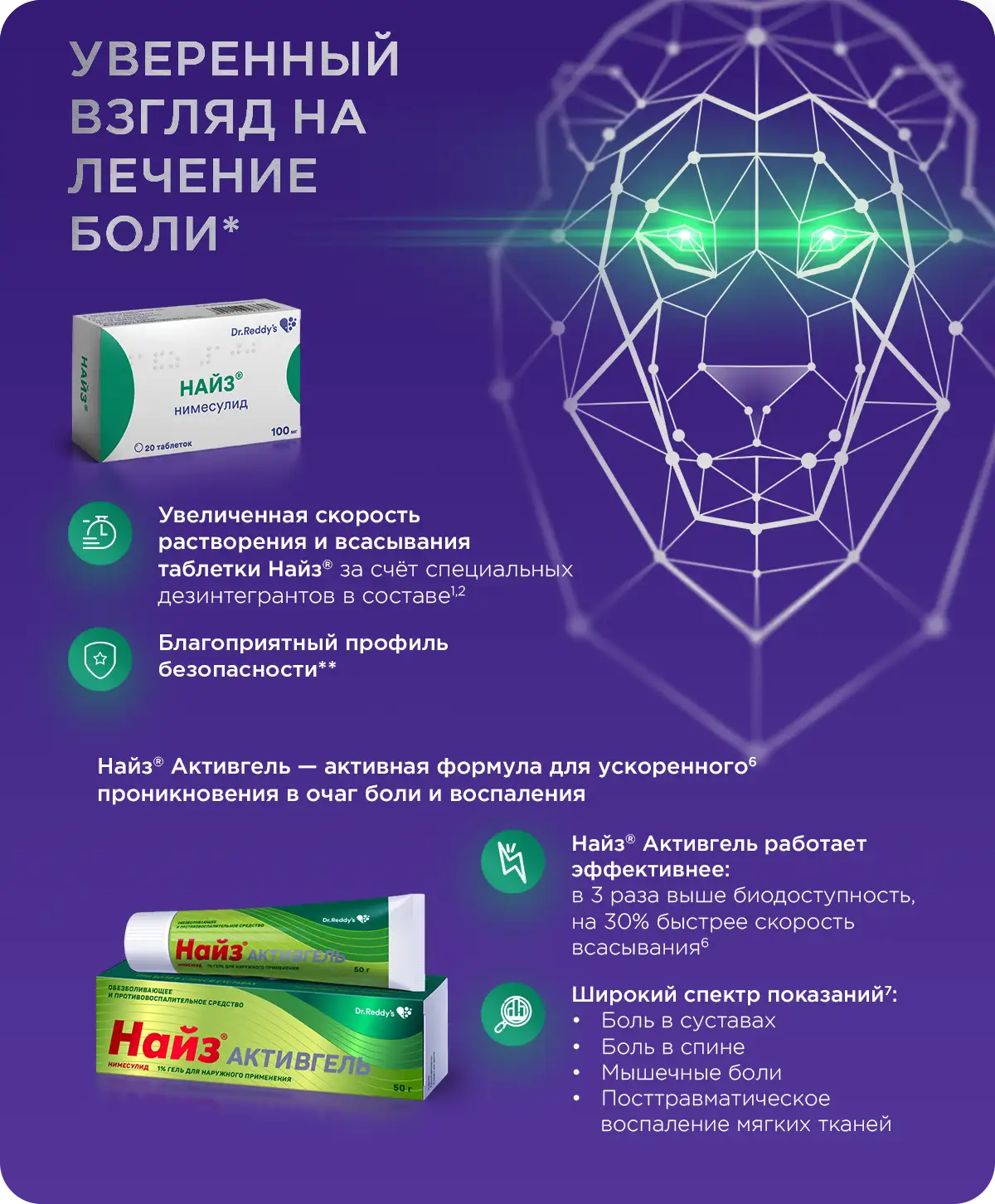 * Найз® 100 мг зарегистрирован в РФ 19.08.1998г. РУ ЛП-№(006398)-(РГ-RU) и является лидером по продажам в упаковках в России среди нимесулидов для перорального приема, IQVIA MAT март 2025