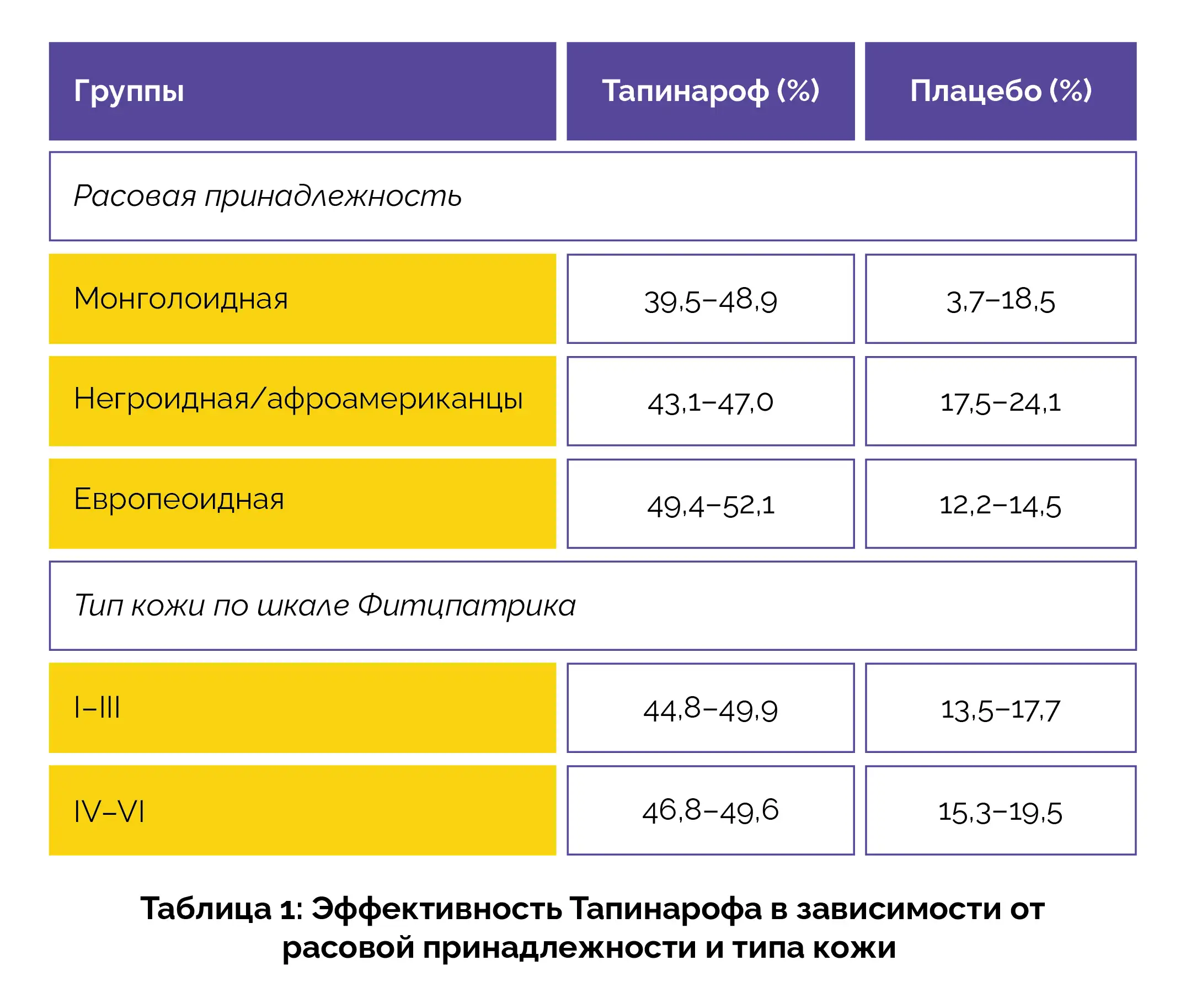 В обоих исследованиях большая доля участников, получавших тапинароф, достигла первичной конечной точки по сравнению с теми, кто получал плацебо, независимо от расы или типа кожи по шкале Фицпатрика. При лечении тапинарофом наблюдались стабильно превосходные ответы во всех расовых группах и группах с разными типами кожи (таблица 1).