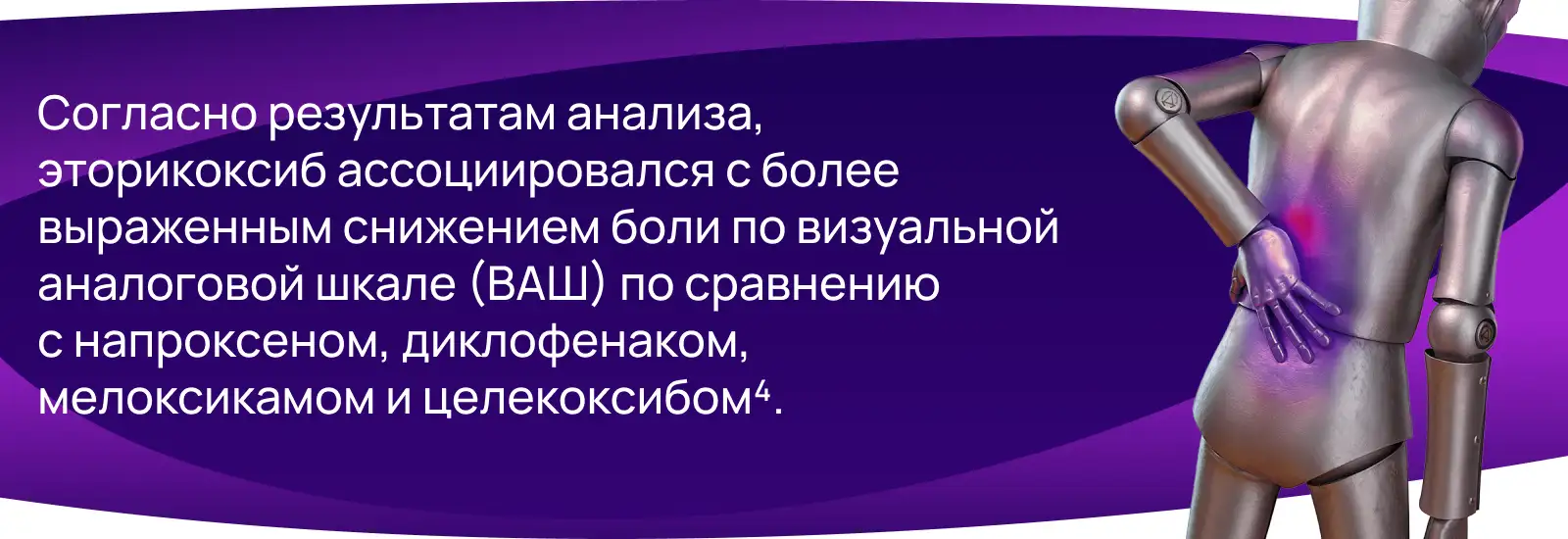 В РКИ, в котором приняли участие 319 пациентов с хронической болью в пояснице, эторикоксиб в дозе 60 мг применялся ежедневно в течение 12 недель [7].