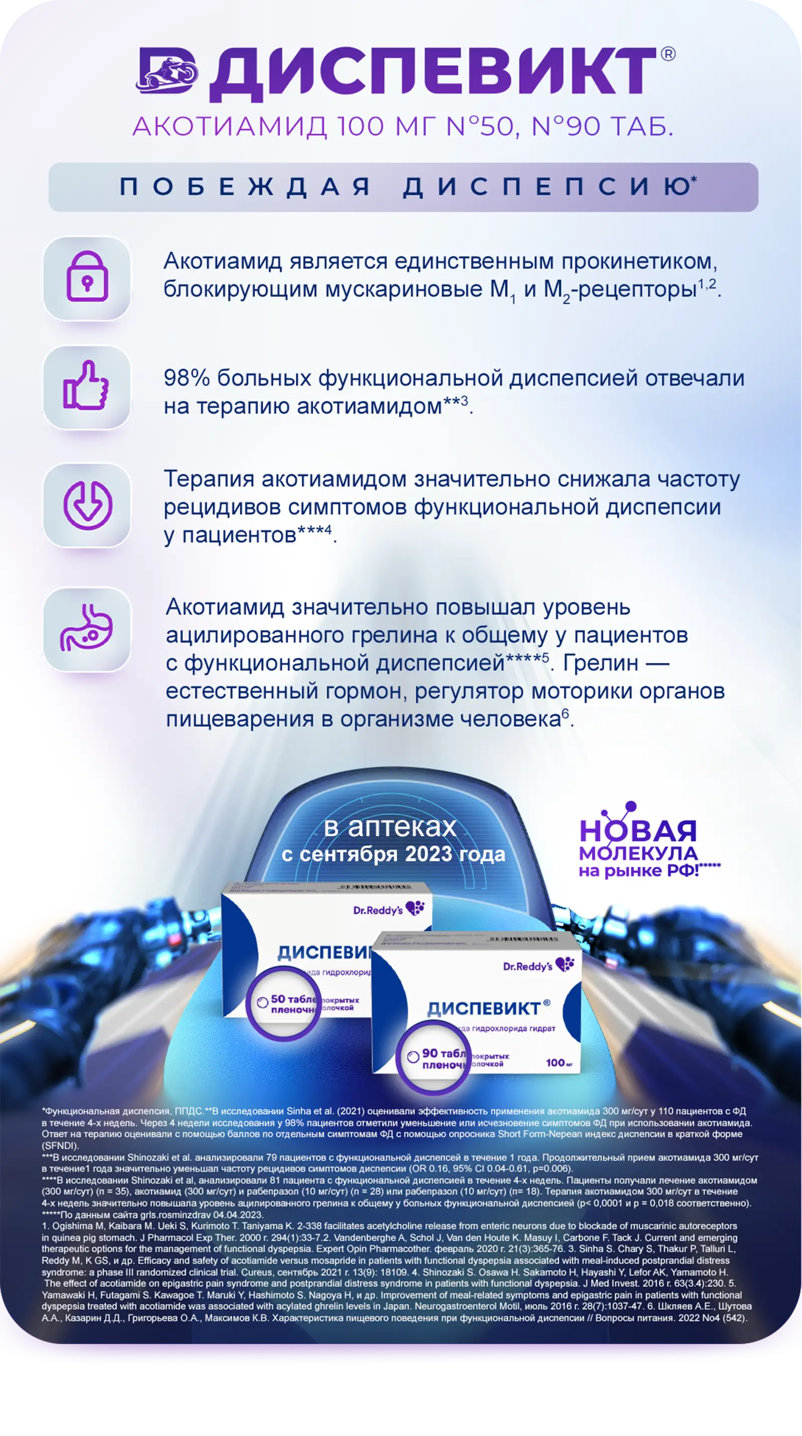 Таким образом, при выборе терапии ППДС можно учитывать не только моторный, но и гормональный компонент — особенно в случаях, когда симптомы устойчивы к стандартной терапии. Акотиамид (Диспевикт®) — один из препаратов, для которого в клинических исследованиях показана связь между повышением соотношения ацилированного грелина к общему грелину, улучшением гастрального опорожнения и снижением выраженности постпрандиальных симптомов.