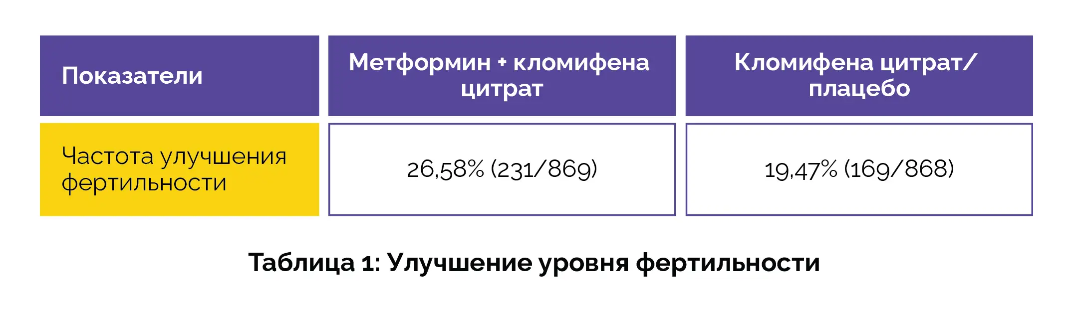 Комбинация метформина и кломифена цитрата превосходит по эффективности монотерапию кломифеном в улучшении показателей фертильности у женщин с СПКЯ.