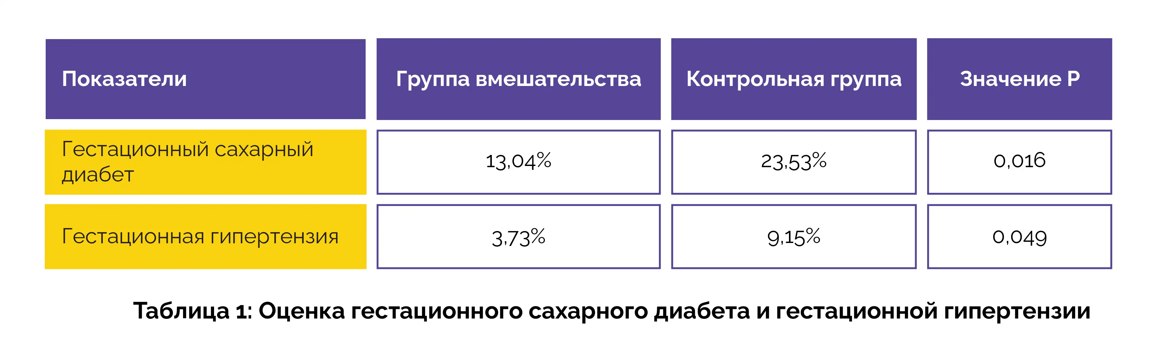 По сравнению с контрольной группой в группе вмешательства наблюдались более низкая частота развития гестационного сахарного диабета и гестационной гипертензии (таблица 1).
