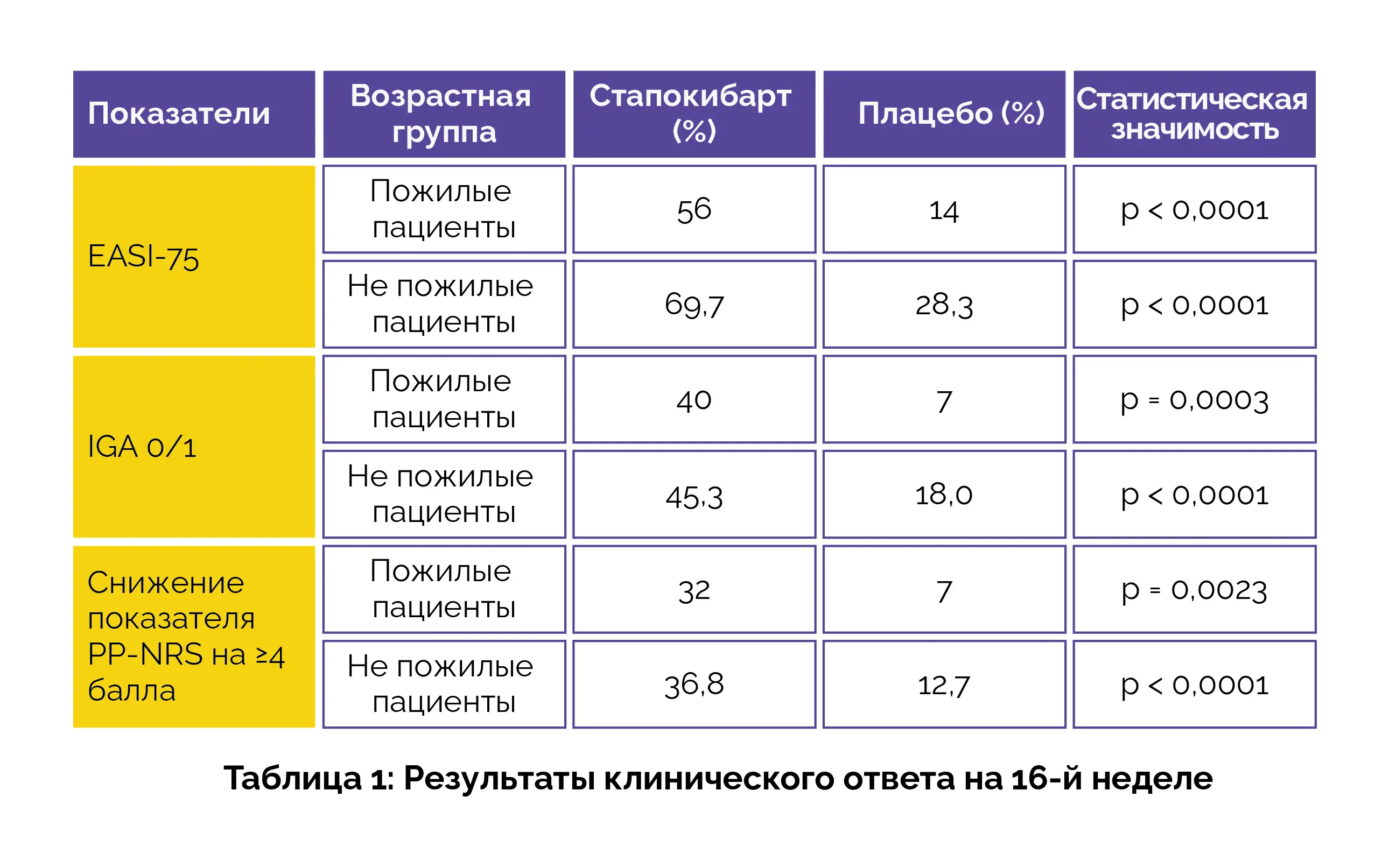 На 16-й неделе стапокибарт продемонстрировал превосходную клиническую эффективность по сравнению с плацебо в обеих возрастных категориях. У пациентов пожилого и молодого возраста, получавших стапокибарт, наблюдались более высокие показатели ответа по шкалам EASI-75, IGA 0/1 и улучшение показателей зуда на ≥4 балла. Продолжение лечения на этапе поддерживающей терапии привело к устойчивому и прогрессивному улучшению всех измеренных показателей (таблица 1).