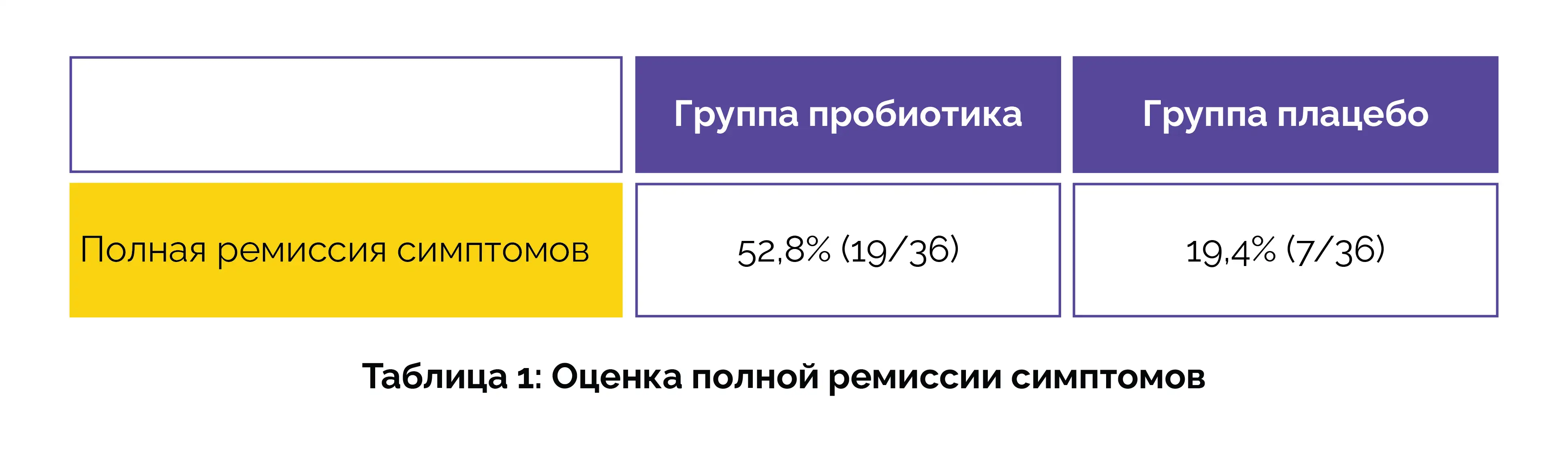 Оценки симптомов проводились с интервалом в 4 недели с использованием валидированных шкал: Шкалы влияния на качество жизни (LIS), Шкалы частоты боли (PFS), Шкалы интенсивности боли (PIS) и Шкалы тяжести симптомов СРК (IBS-SSS). Работу кишечника оценивали с помощью Бристольской шкалы стула/формы кала (BSC). К 12 неделе в группе, принимавшей пробиотик, наблюдалась более высокая частота полной ремиссии симптомов по сравнению с группой, принимавшей плацебо (отношение шансов 0,216), как показано в таблице 1: