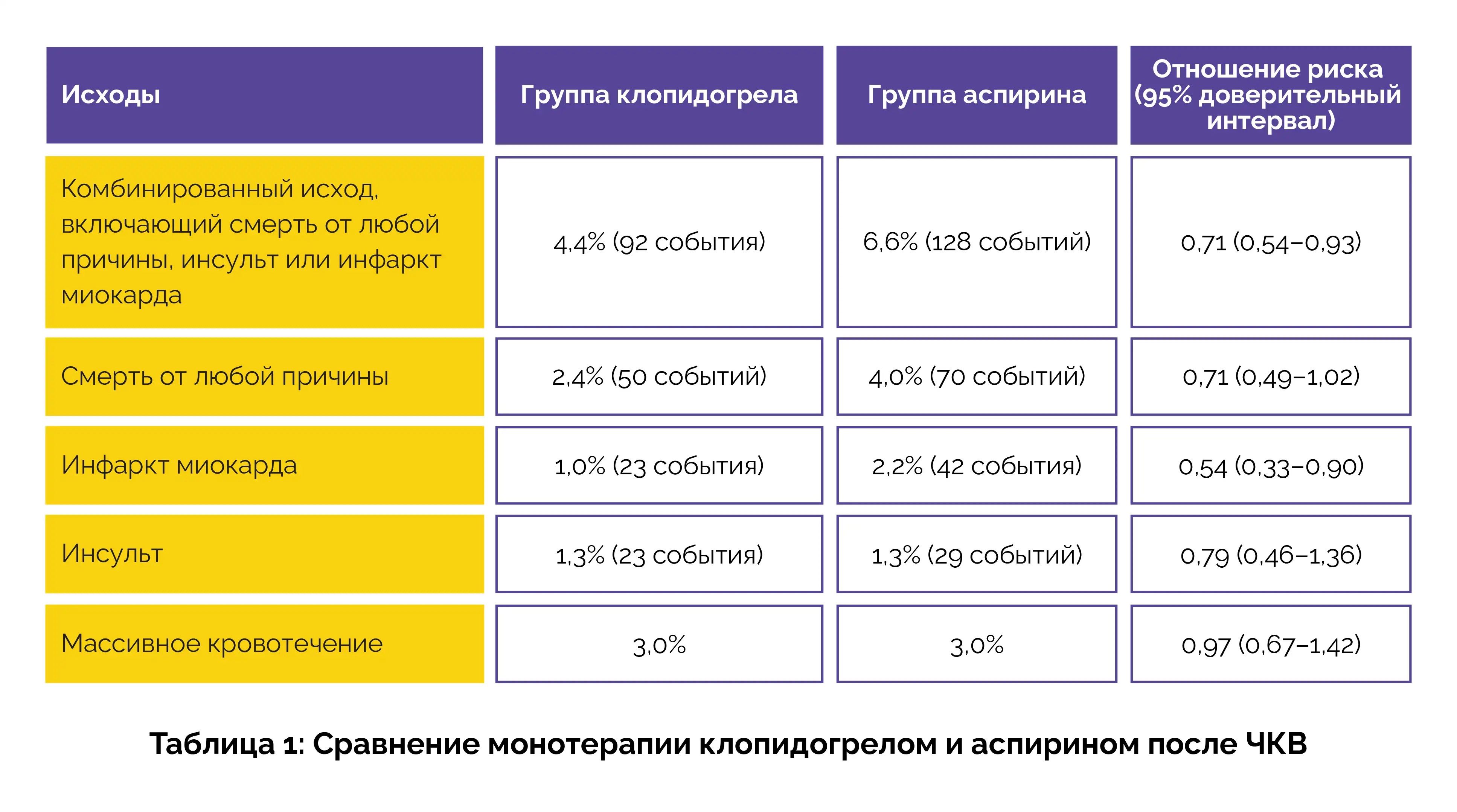 Таким образом, у пациентов с повышенным сердечно-сосудистым риском, завершивших курс ДААТ после ЧКВ, монотерапия клопидогрелом обеспечивает более высокую защиту от основных сердечно-сосудистых событий по сравнению с аспирином и не сопровождается повышением риска кровотечений.