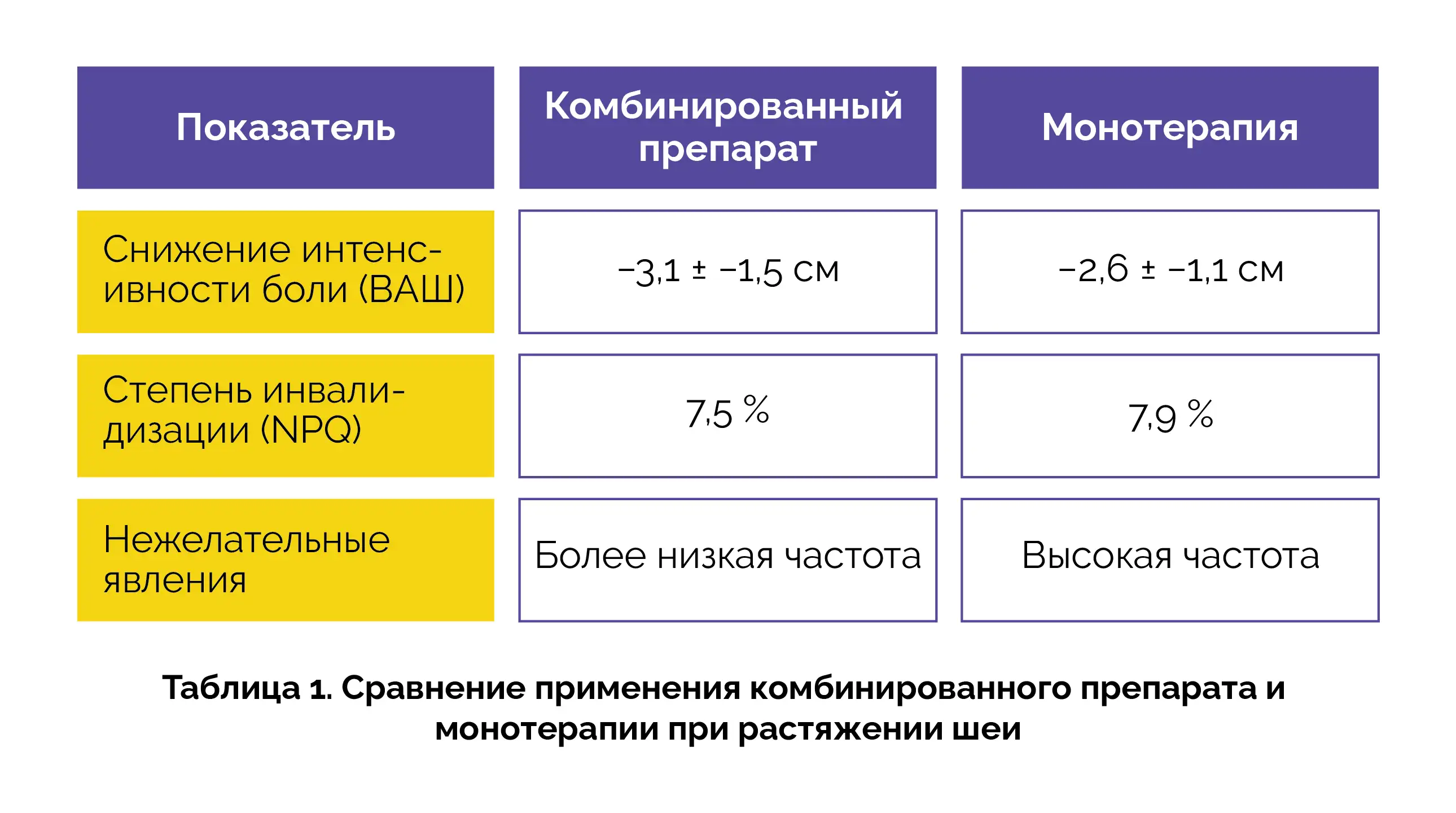 Пациенты принимали препараты внутрь каждые 8 часов в течение 7 дней. Интенсивность боли оценивали с помощью визуальной аналоговой шкалы (ВАШ), а степень инвалидизации — с помощью опросника для оценки боли в шее больницы «Нортвик‑Парк» (NPQ). Терапия комбинированным препаратом обеспечивала снижение интенсивности боли и процентного показателя инвалидизации по сравнению с монотерапией декскетопрофеном, при меньшем количестве нежелательных эффектов (см. таблицу 1).