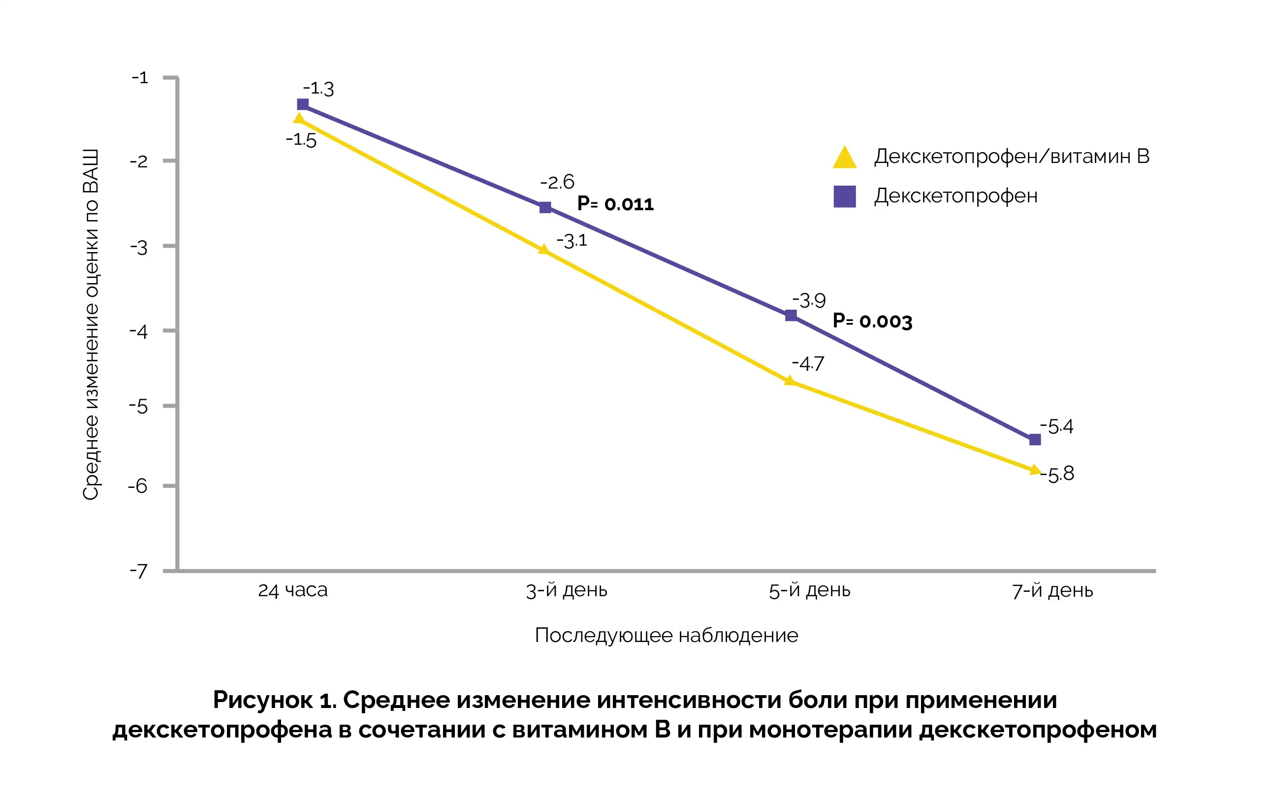 Терапия комбинированным препаратом, содержащим декскетопрофен и витамины группы В, приводила к существенному снижению интенсивности боли начиная с третьего дня и поддерживала это облегчение боли на протяжении всего 7-дневного периода лечения (см. рисунок 1).