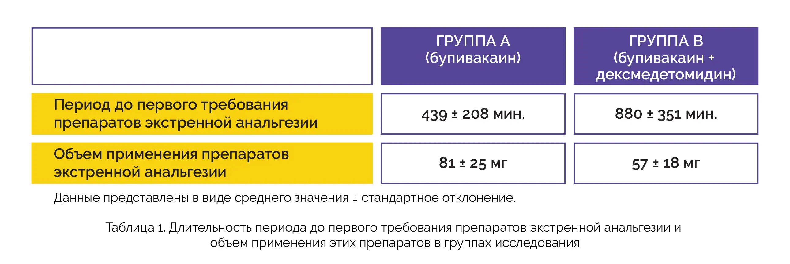 В течение периода длительностью до 18 часов между группами было выявлено статистически значимое различие в отношении оценок удовлетворенности пациенток лечением и оценок интенсивности боли, при этом различия в оценках по шкале RSS отсутствовали. Таким образом, в отсутствие интратекального введения морфина дексмедетомидин может быть эффективным вспомогательным средством при выполнении блокады КМП у пациенток, перенесших кесарево сечение, которое позволяет уменьшить объем применения препаратов экстренной анальгезии и повысить удовлетворенность пациенток лечением в течение первых 18 часов после операции.