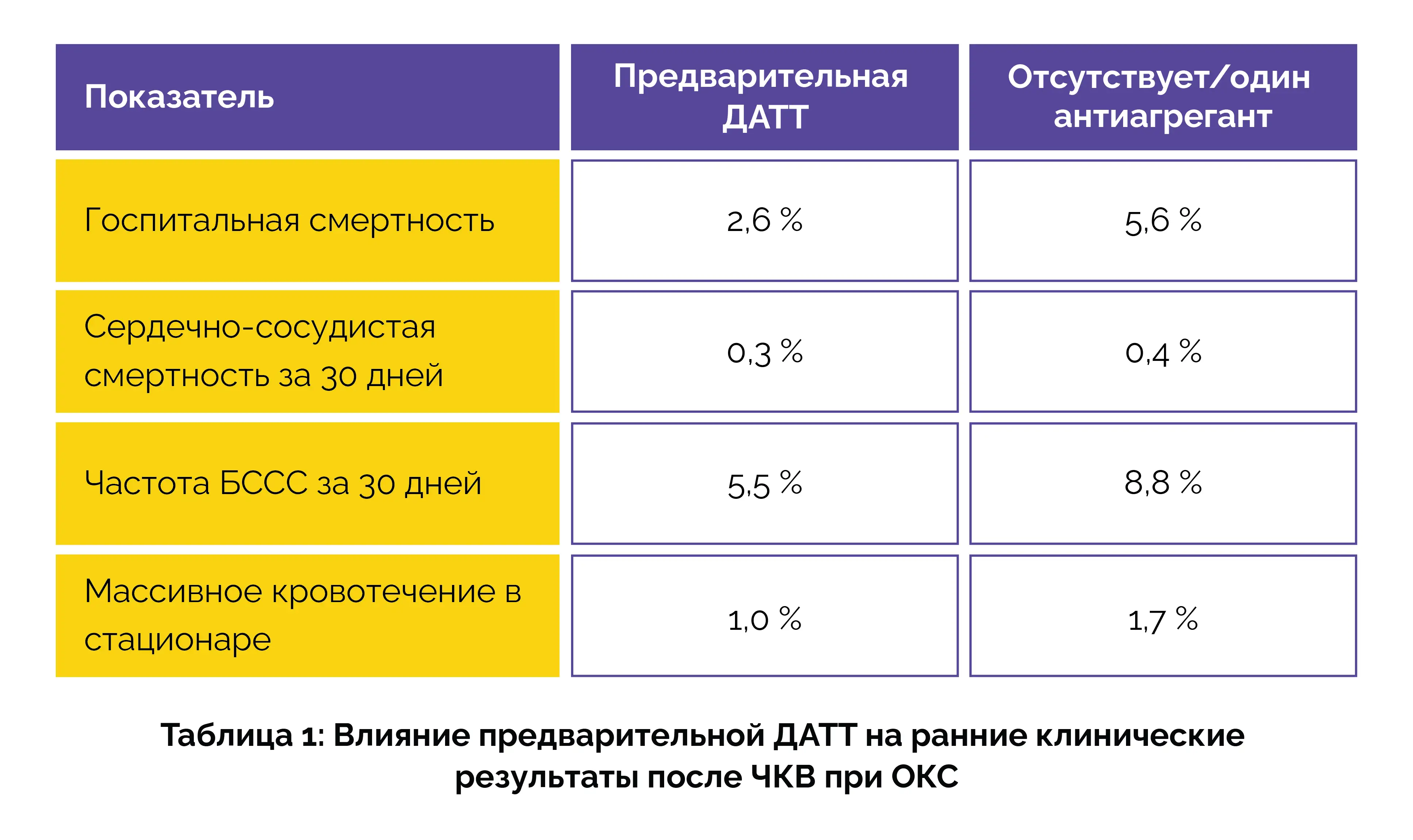 Назначение ДАТТ перед ЧКВ часто практикуется у пациентов с ОКС. Однако это не приводит к достоверному снижению частоты тромбозов стента, БССС или госпитальной смертности.