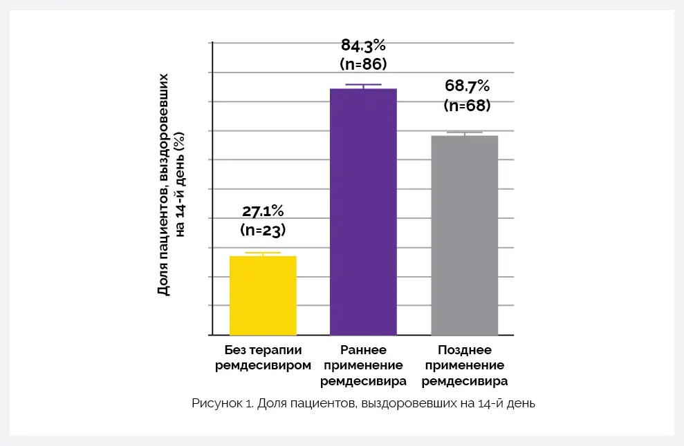 На 14-й день после появления симптомов в когорте ранней терапии ремдесивиром доля случаев выздоровления была больше, чем в когортах без терапии ремдесивиром и поздней терапии ремдесивиром (скорректированное соотношение шансов (ОШ): 2,65) (см. рисунок 1).