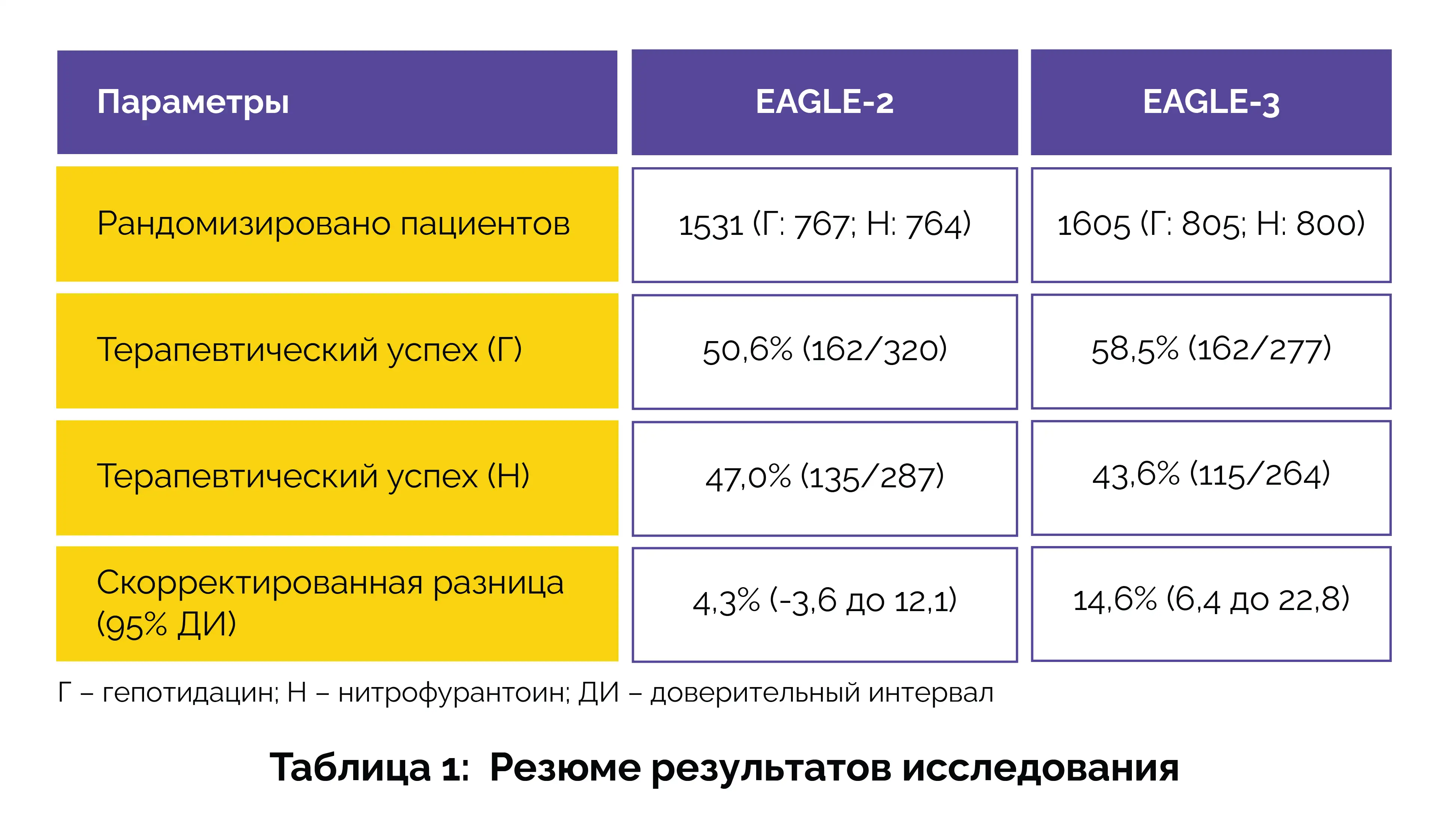 В целях безопасности все участники, которые были рандомизированы и приняли хотя бы одну дозу препарата, контролировались на предмет побочных эффектов. С точки зрения результатов гепотидацин не уступал по эффективности нитрофурантоину в обоих исследованиях, а в одном исследовании он даже продемонстрировал превосходство, как показано в таблице 1:
