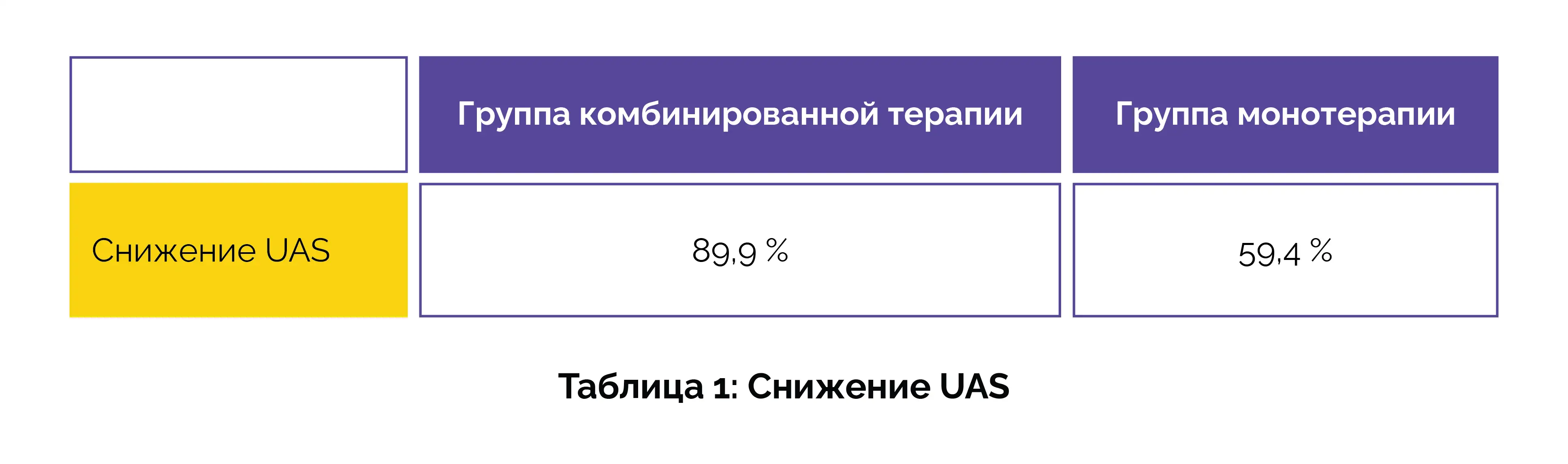 Значения UAS7 — ключевого показателя тяжести крапивницы — отслеживались еженедельно в течение 6 недель. Первичной конечной точкой были изменения UAS, а вторичные конечные точки включали контроль симптомов и мониторинг безопасности. Полученные результаты были убедительными. К 6 неделе в группе комбинированной терапии наблюдалось более выраженное снижение UAS по сравнению с группой монотерапии (таблица 1).