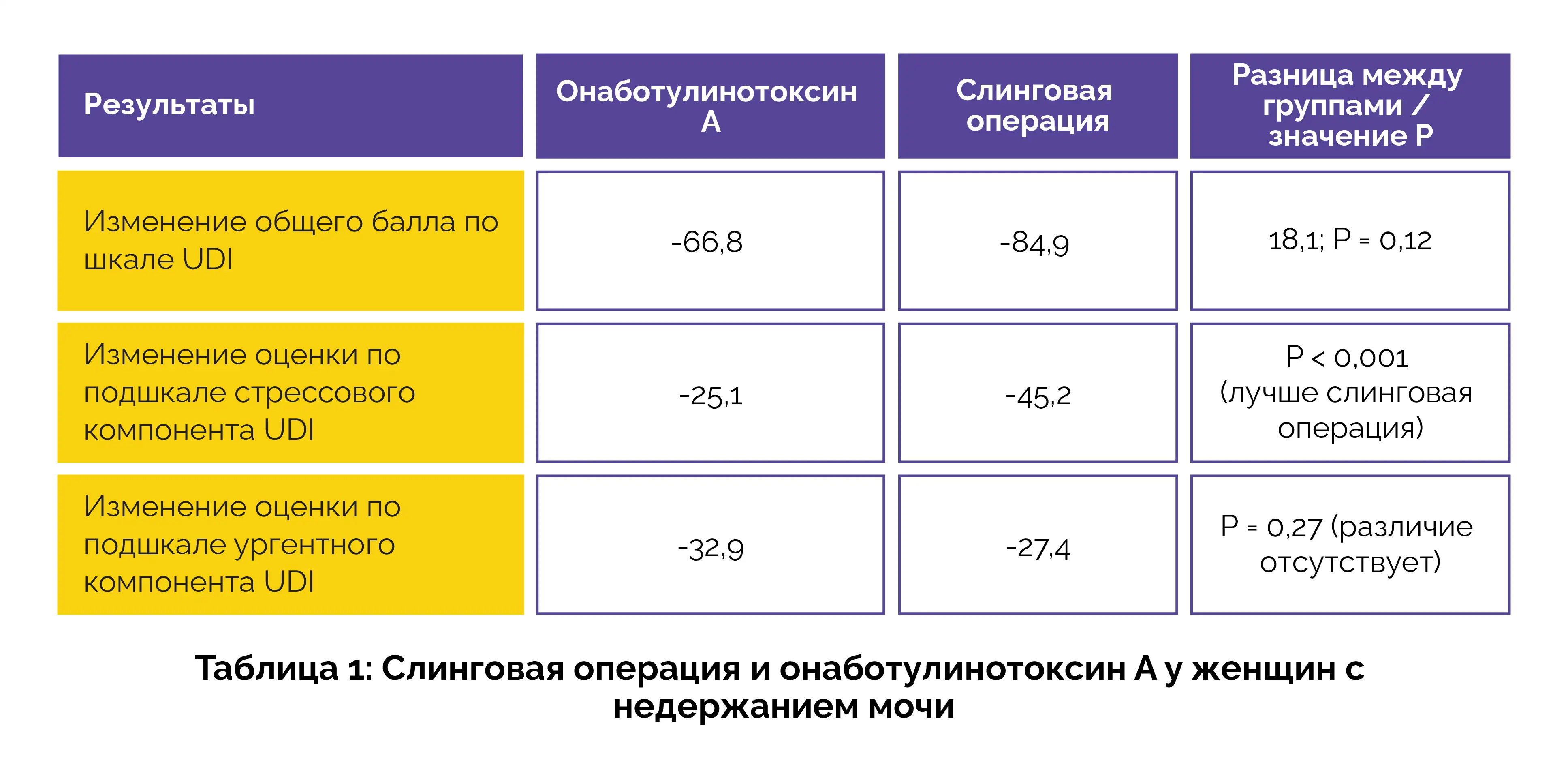 При сохранении симптомов в течение 6–12 месяцев пациенткам разрешалось переходить на другой метод или получить дополнительное лечение. В общей сложности 137 женщин (средний возраст 59 лет) завершили наблюдение. Через 6 месяцев в обеих группах отмечено значительное улучшение общего балла по шкале UDI (Urogenital Distress Inventory; Опросник урогенитального дистресса), которая представляет собой валидированный инструмент для оценки выраженности симптомов недержания мочи (шкала от 0 до 300). Разница между группами (18,1 балла) не достигла статистической значимости. Слинговая операция обеспечила более выраженное уменьшение стрессового компонента недержания, тогда как улучшение ургентных симптомов оказалось сходным (Таблица 1).