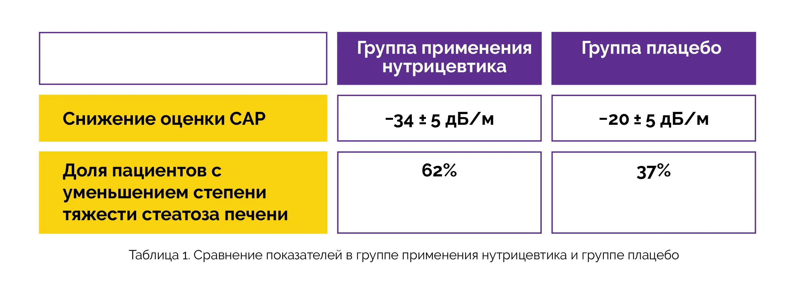 После поправки на вмешивающиеся факторы (такие как оценка CAP и концентрация триглицеридов на исходном уровне, изменение активности гамма-глутамилтрансферазы (ГГТ) в сыворотке крови и потребление растительных белков, животных белков и холестерина в период наблюдения) было установлено, что в группе применения нутрицевтика снижение оценки CAP было более выраженным по сравнению с группой плацебо. У участников исследования, принимавших капсулы с нутрицевтиком, было достигнуто статистически значимо более выраженное уменьшение степени тяжести стеатоза печени по сравнению с участниками, принимавшими плацебо (см. таблицу 1).