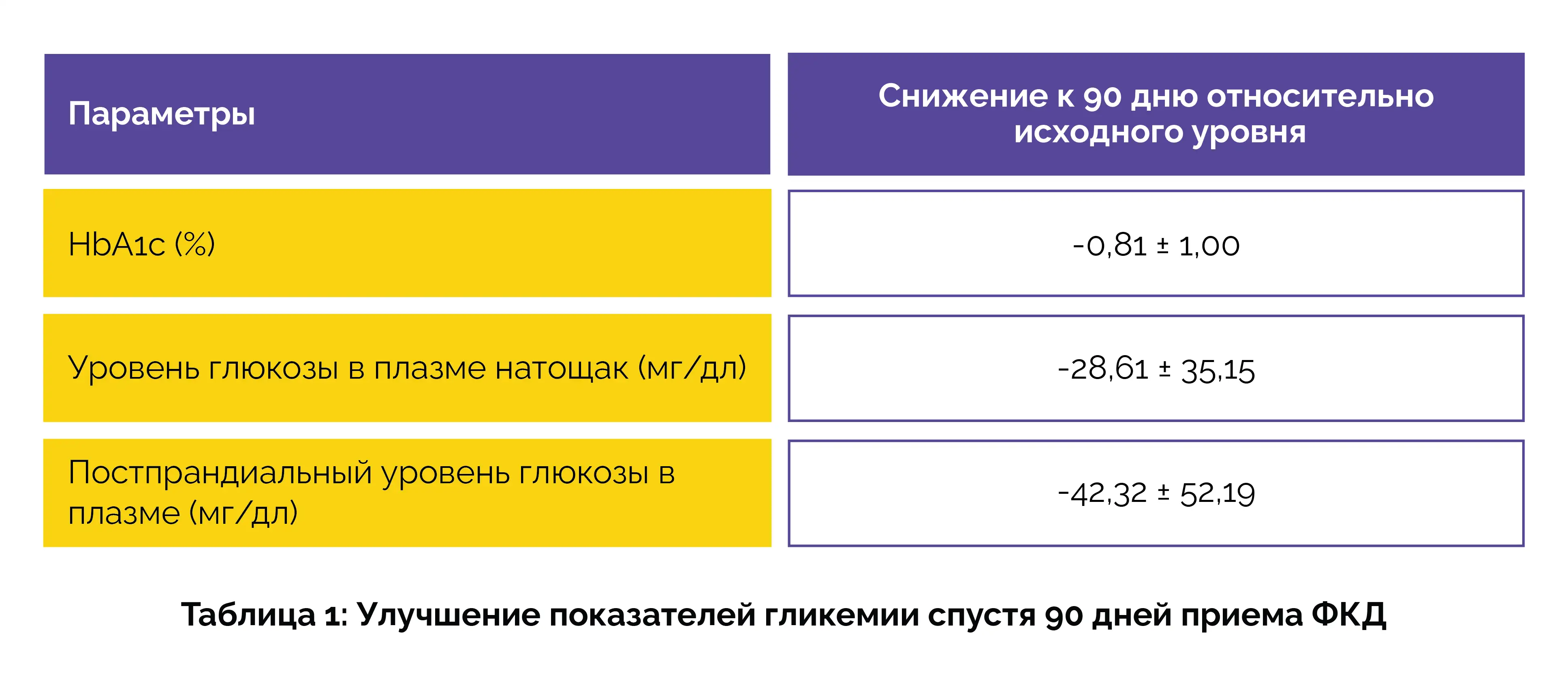 Результаты показали значимое снижение показателей гликемии за 90-дневный период. Среднее значение гликированного гемоглобина (HbA1c) на исходном уровне составило 8,19% ± 1,22. Помимо снижения HbA1c, у пациентов наблюдалось существенное снижение уровня глюкозы в плазме натощак и постпрандиального уровня глюкозы в плазме; в обоих случаях p-значения были менее 0,0001, что указывает на высокую статистическую значимость, как показано в таблице 1: