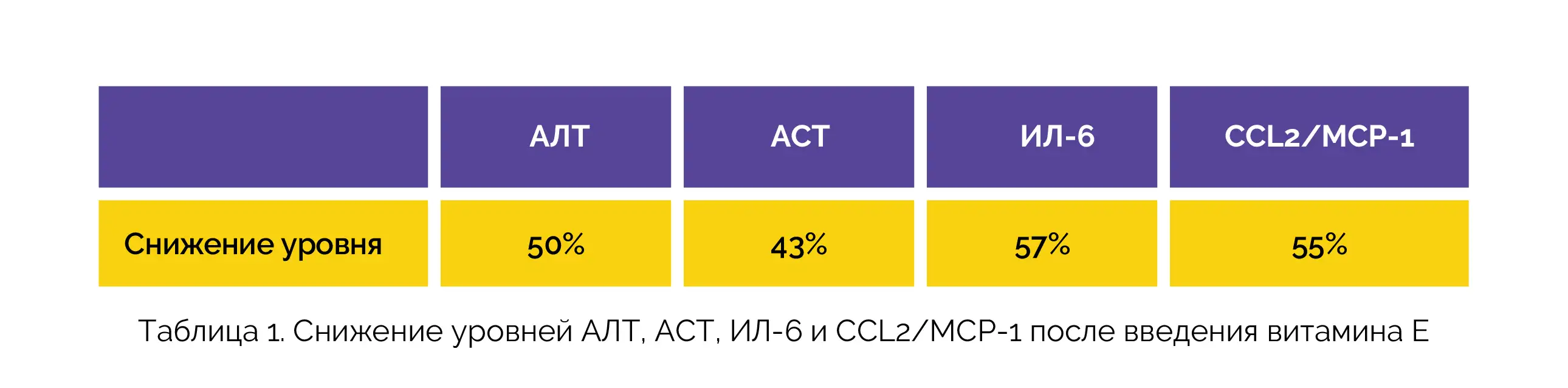 У участников после терапии витамином Е, УДХК и пентоксифиллином отмечалось статистически значимое снижение уровней аминотрансфераз печени, сывороточных хемокинов и цитокинов. В группе применения витамина Е уровни аминотрансфераз печени, сывороточных хемокинов и цитокинов статистически значимо снизились по сравнению с группами применения УДХК и пентоксифиллина (см. таблицу 1).