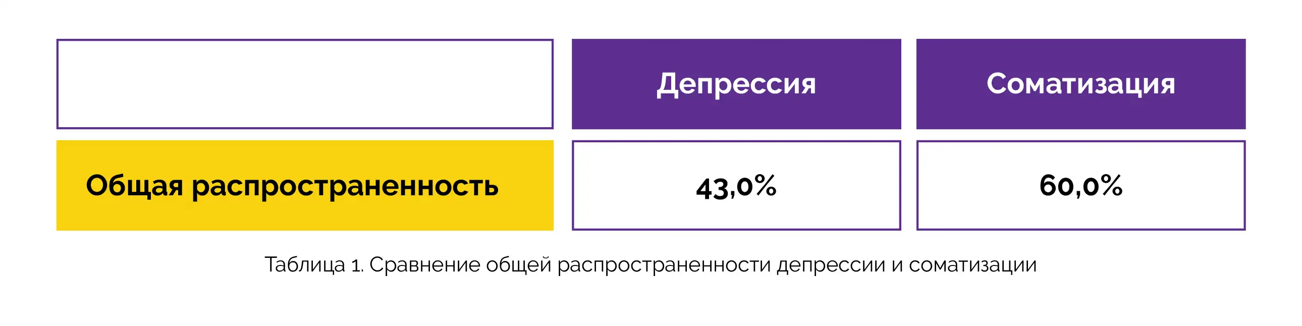 Средняя общая оценка депрессии составляла 0,92, что указывало на депрессию умеренной степени. Средняя общая оценка соматизации составляла 1,09, что указывало на соматизацию тяжелой степени. Все оценки свидетельствовали о наличии статистически значимой гетерогенности (I2> 90 %). Согласно результатам анализа качества, 80,9 % включенных исследований характеризовались низким или средним уровнем риска систематических ошибок. Таким образом, у пациентов с ДВНЧС, которые обращаются за медицинской помощью, психические заболевания широко распространены.