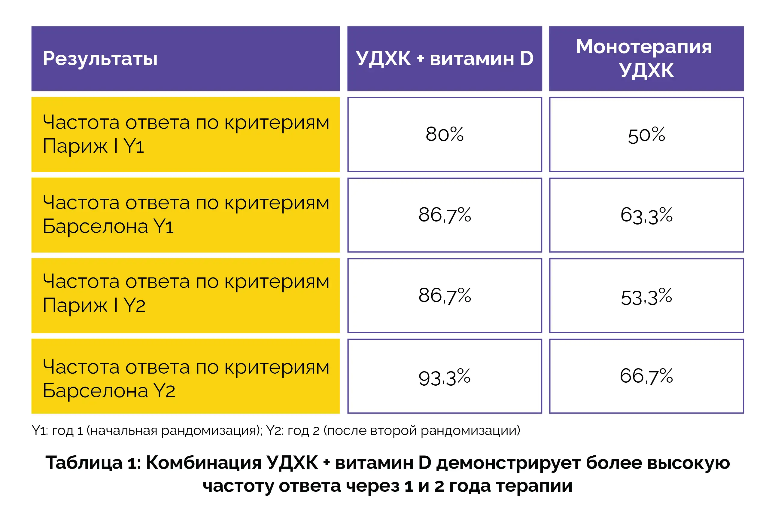 Комбинация УДХК и витамина D обеспечивала более высокую частоту ответа на лечение, чем применение только УДХК, как по критериям Париж I, так и Барселона. Это превосходство сохранялось в течение второго года исследования, причем подгруппа УДХК + витамин D продолжала демонстрировать лучшие результаты, чем подгруппа монотерапии УДХК (таблица 1).