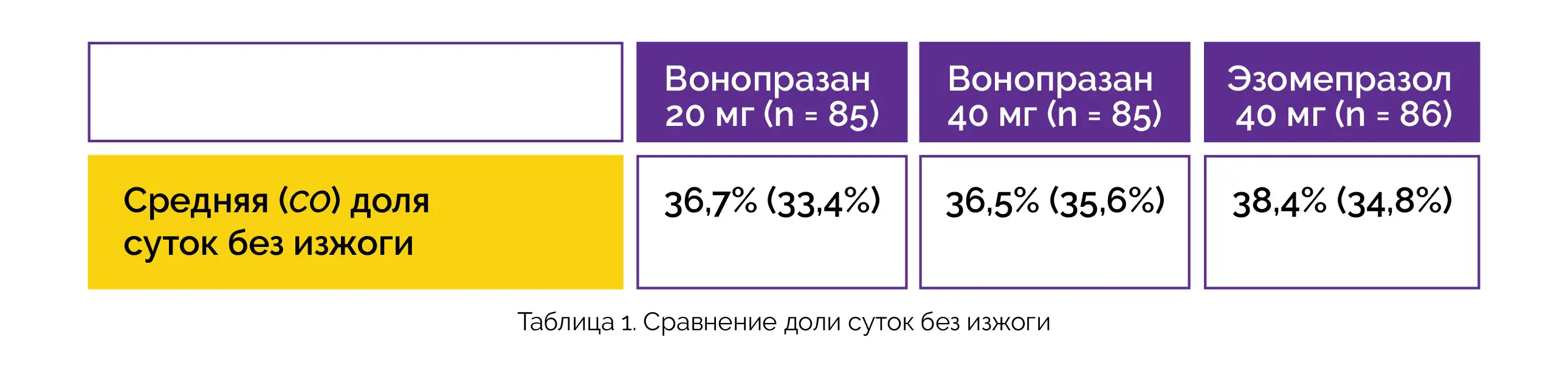 В исследовании приняли участие 256 пациентов (средний возраст — 52,6 года; доля женщин — 59,4 %) с симптомами ГЭРБ и частичным ответом на применение эзомепразола в терапевтической дозе, которых рандомизировали в группу применения вонопразана в дозе 20 мг (n = 85) и 40 мг (n = 85) один раз в сутки (1 р/сут) или в группу применения эзомепразола в дозе 40 мг 1 /сут (n = 86). Статистически значимых различий между группами в средней (стандартное отклонение (СО)) доле суток без изжоги выявлено не было (см. таблицу 1).