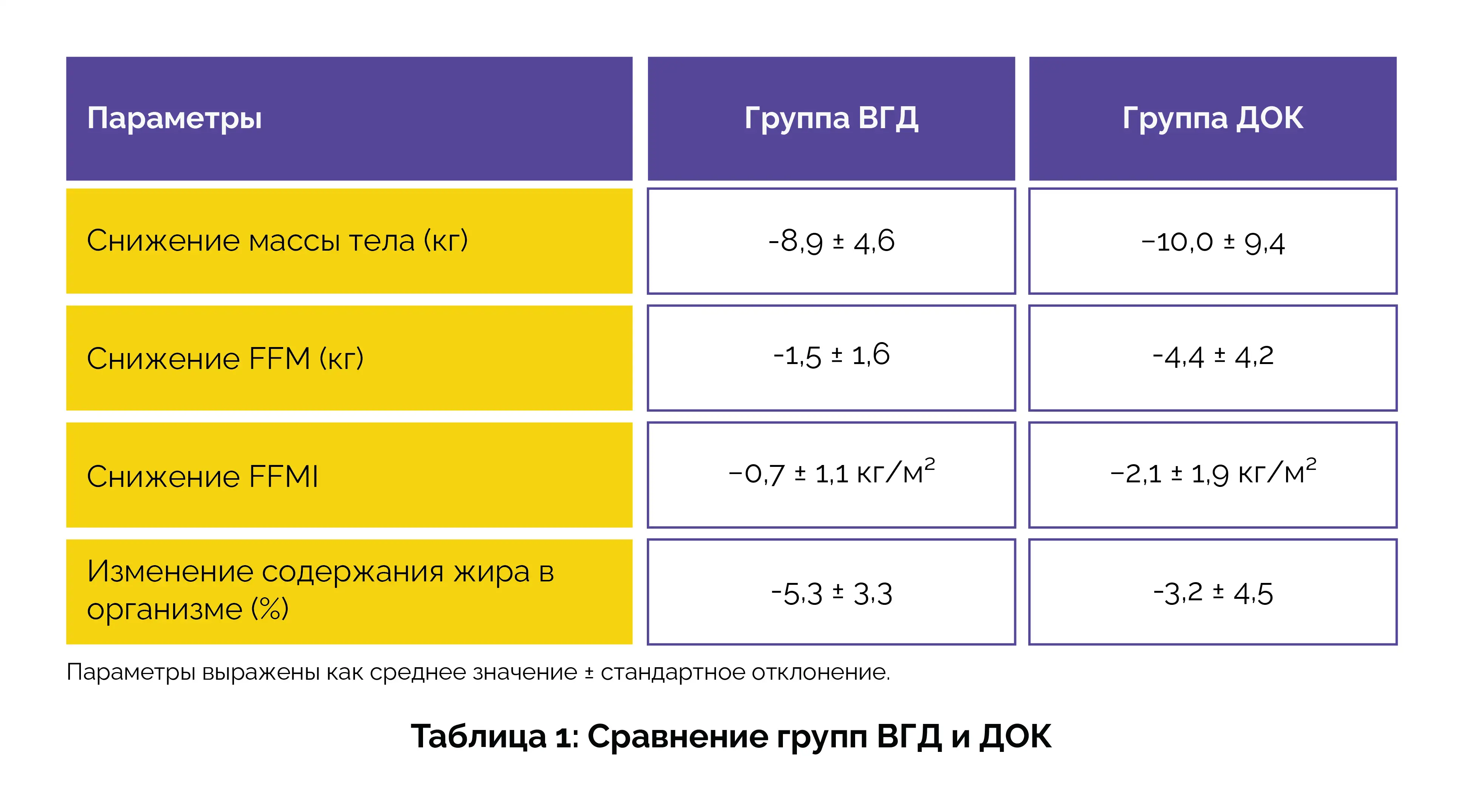 Хотя обе группы продемонстрировали сопоставимое снижение массы тела, группа ВГД сохранила больше безжировой массы тела (FFM) и более высокие значения индекса безжировой массы тела (FFMI). Снижение FFM было значительно менее выражено в группе ВГД по сравнению с группой ДОК. Аналогичным образом, снижение FFMI было меньше в группе ВГД. Кроме того, в группе ВГД было достигнуто более существенное снижение процентного содержания жира в организме, чем в группе ДОК (таблица 1).