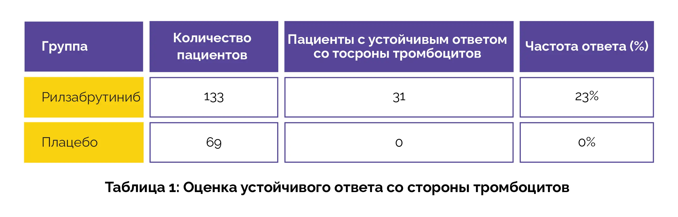 Безопасность и эффективность рилзабрутиниба оценивались в 24-недельном двойном слепом клиническом исследовании с параллельными группами, оценивающем его способность достигать устойчивого ответа со стороны тромбоцитов, определяемого как устойчивое увеличение количества тромбоцитов по сравнению с исходным уровнем в течение большей части последних 12 недель лечения. В общей сложности 202 взрослых пациента с персистирующей или хронической ИТП были случайным образом распределены в две группы: одна получала рилзабрутиниб, другая — плацебо. В группе, получавшей рилзабрутиниб, более высокая доля пациентов достигла устойчивого ответа со стороны тромбоцитов по сравнению с группой плацебо (таблица 1).