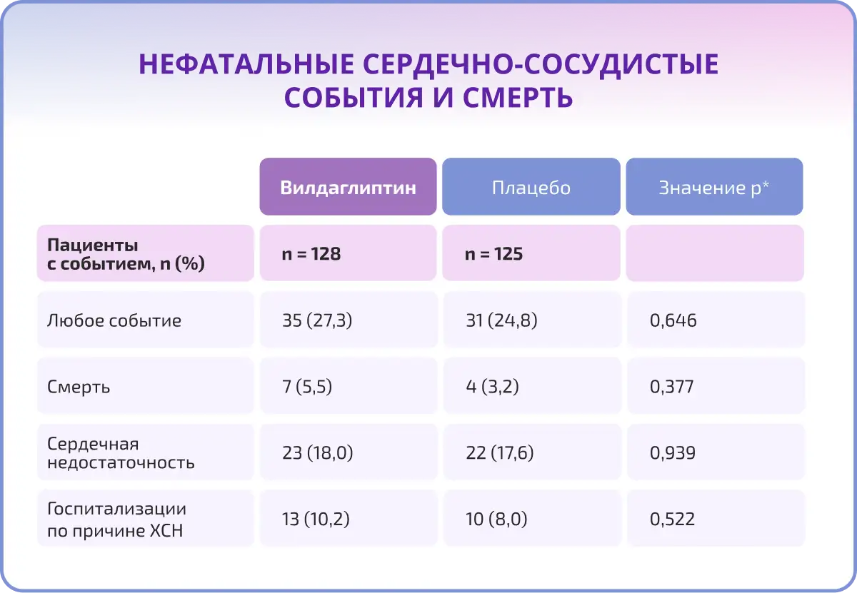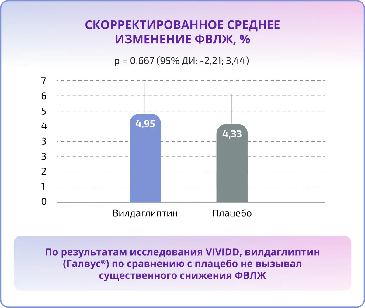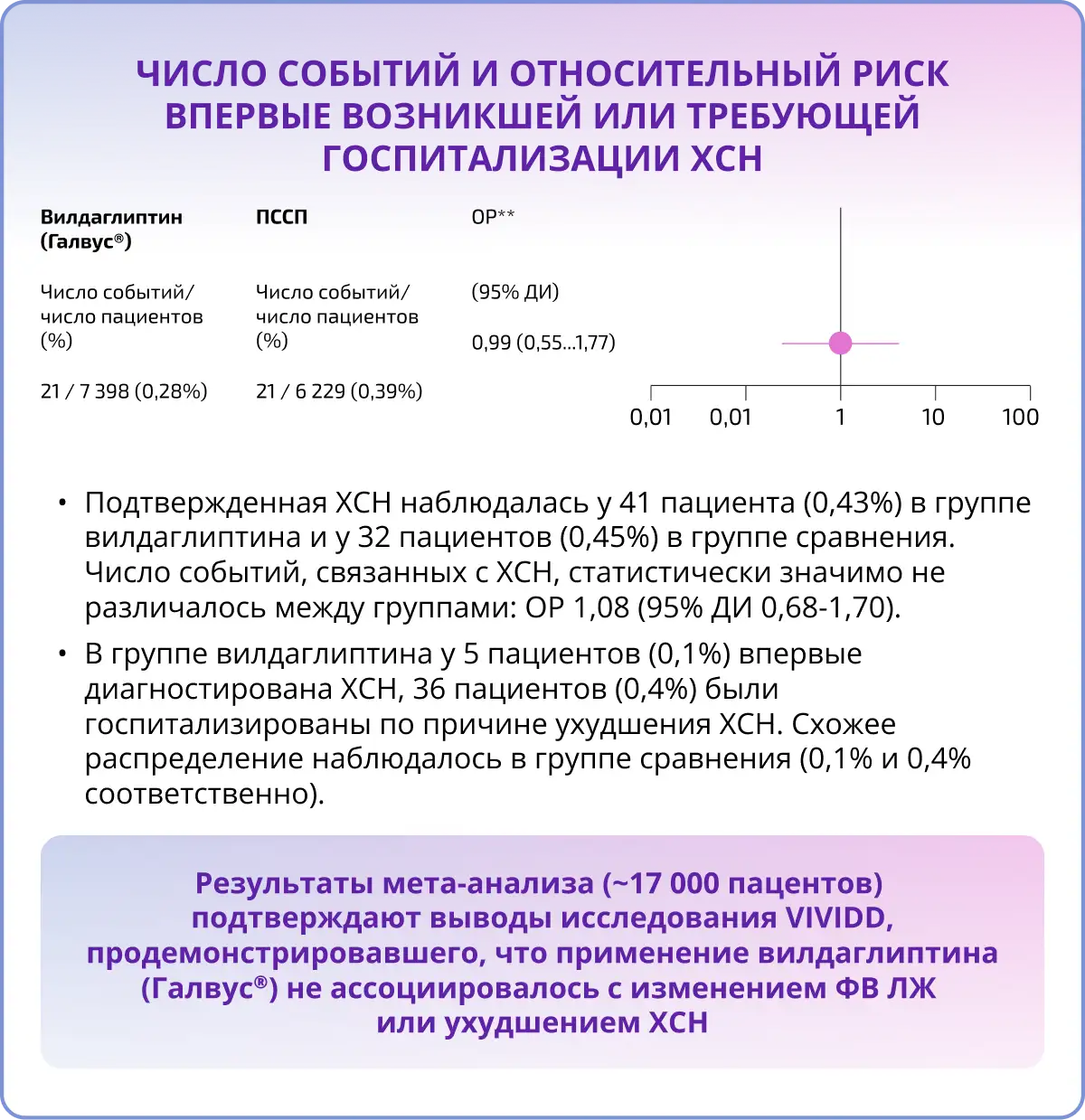 Заключение ЕМА (Европейское медицинское агентство): «Терапия вилдаглиптином не ассоциируется с изменением функции ЛЖ или ухудшением существующей ХСН»