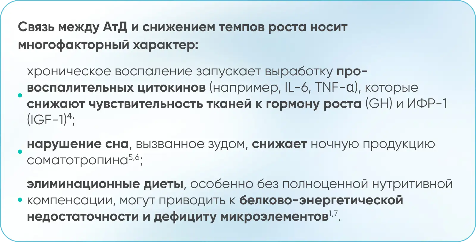 Использование топических глюкокортикоидов (ГК) при АтД может вызывать опасения, однако данные не подтверждают выраженного влияния наружной терапии на рост [7]. Наоборот, адекватный контроль воспаления способствует нормализации сна и аппетита, снижая риски отставания в развитии [2].