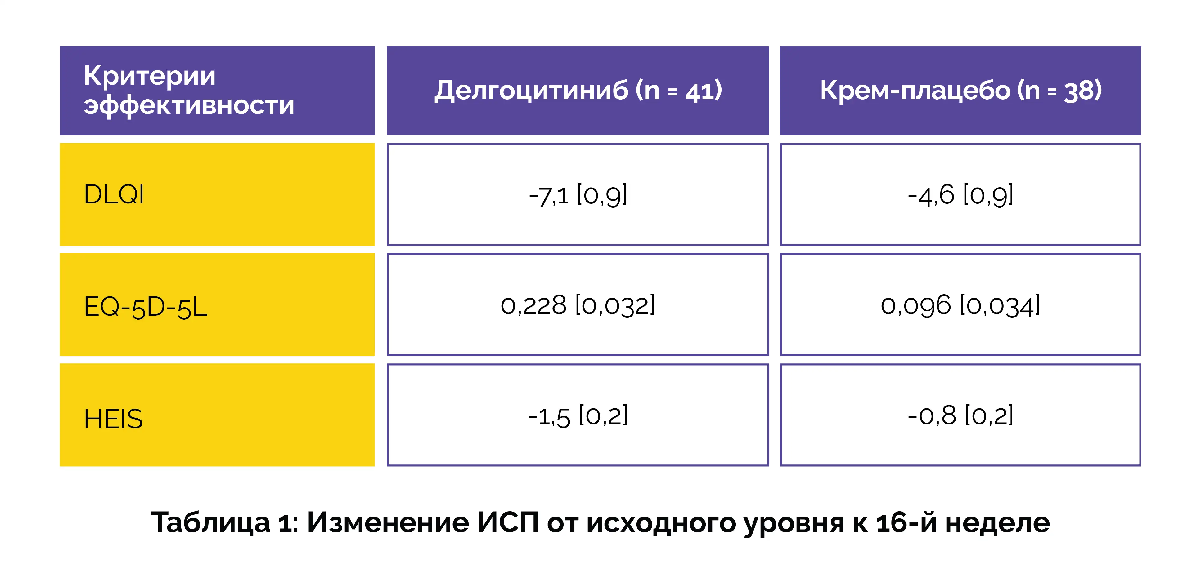 При скрининге у пациентов с легкой формой ЭКР (n=93) средние баллы (стандартное отклонение) для DLQI составили 8,1 (5,8), для EQ-5D-5L — 0,788 (0,175) и для HEIS — 1,7 (0,8). Напротив, у пациентов с умеренной или тяжелой ЭКР (n=202) средние баллы составили 12,1 (6,9), 0,689 (0,236) и 2,3 (0,9) соответственно. У пациентов со среднетяжелой и тяжелой ЭКР лечение делгоцитинибом (n=41) привело к более выраженному улучшению от исходного уровня к 16-й неделе по сравнению с плацебо (n=38), как показано в Таблице 1: