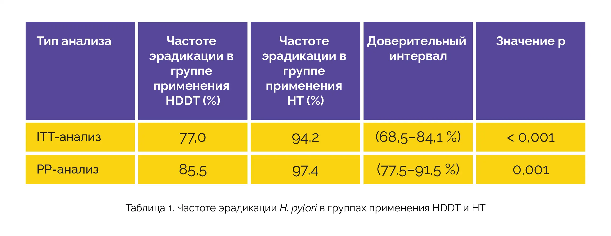 Контакт для последующего наблюдения был утрачен у 12 пациентов в группе применения HDDT и 4 пациентов в группе применения HT, в результате чего в анализ данных пациентов, завершивших исследование без нарушений протокола (PP-анализ), были включены 110 пациентов в группе применения HDDT и 117 пациентов в группе применения HT. Результат эрадикации был определен с помощью уреазного дыхательного теста через 8 недель.