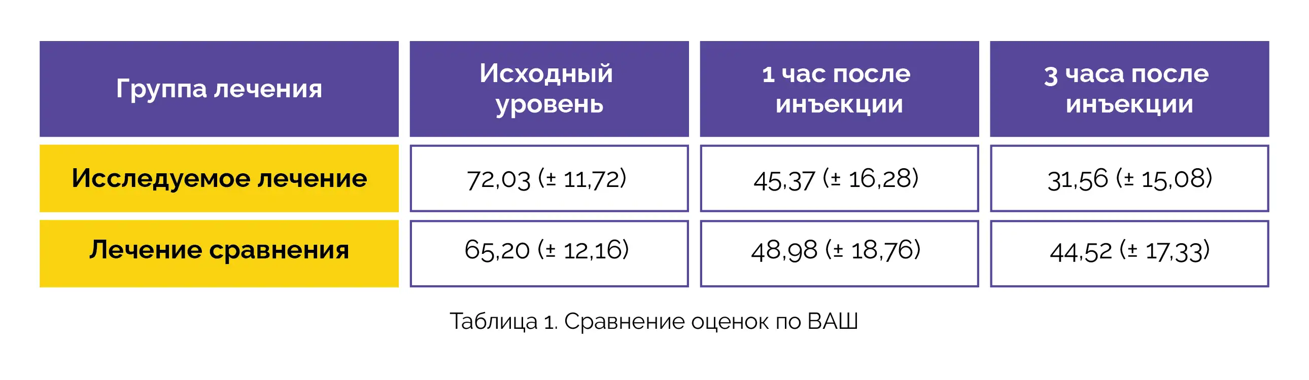Исследуемое лечение превосходило по эффективности лечение сравнения в отношении снижения интенсивности боли и сокращения расстояния от пальцев до пола при наклоне как через 1 час, так и через 3 часа после инъекции. В группе исследуемого лечения у большей доли пациентов наблюдалось снижение интенсивности боли более чем на 30 % через 1 и 3 часа. Оценки по ВАШ (± стандартное отклонение (СО)) в группах исследуемого лечения и лечения сравнения представлены в таблице 1: