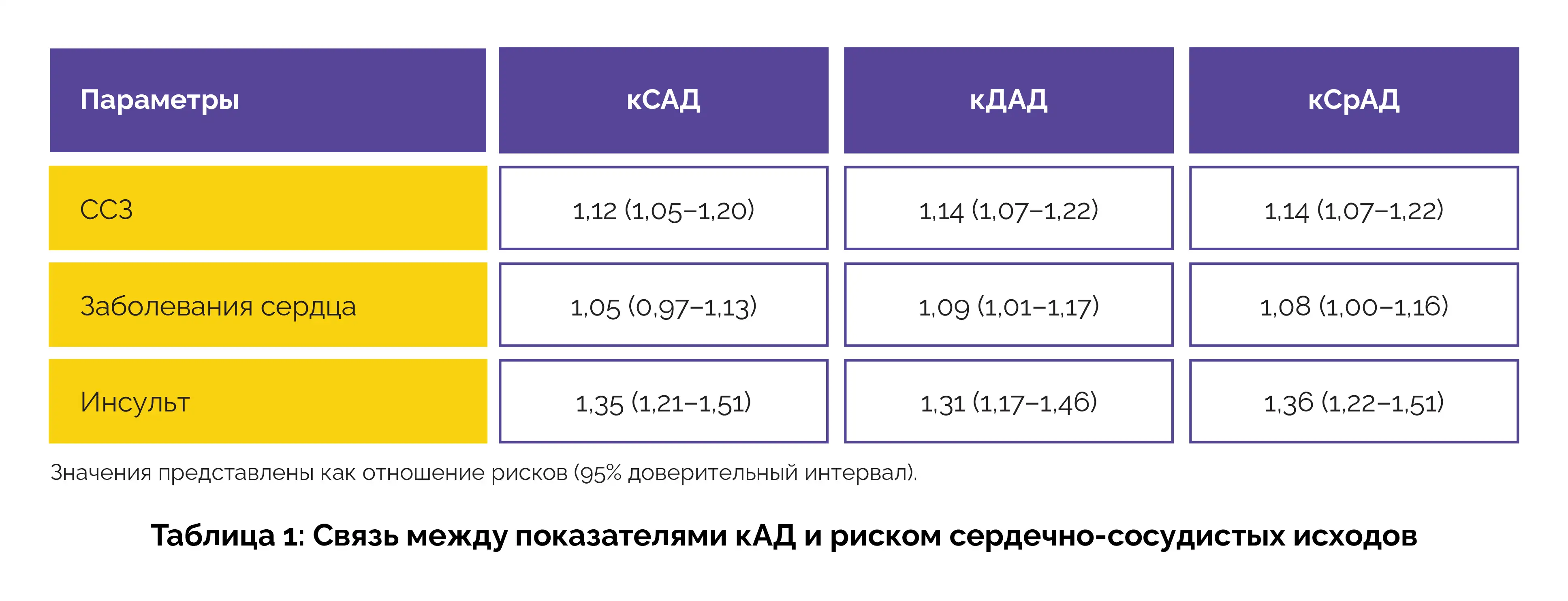 Длительное воздействие повышенного кСАД, кДАД и кСрАД было связано с повышенным риском сердечно-сосудистых заболеваний, особенно у лиц моложе 60 лет, в то время как кПП было связано с инсультом независимо от возраста. Кумулятивные показатели АД могут служить более надежным предиктором сердечно-сосудистых событий, чем одномоментные показатели АД, что подчеркивает важность постоянного контроля АД при оценке сердечно-сосудистого риска.