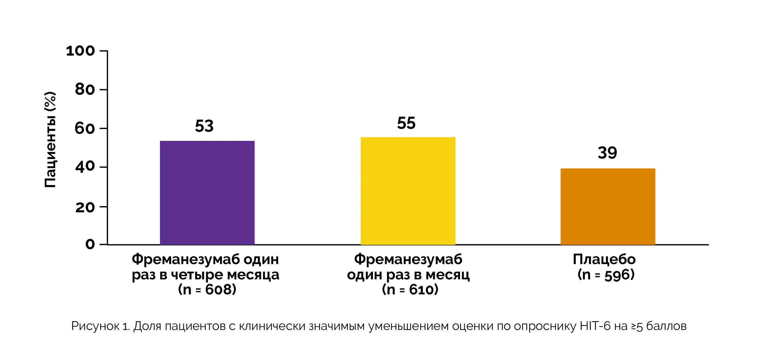 Фреманезумаб статистически значимо превзошел плацебо по показателю процентной доли пациентов с уменьшением оценки по опроснику HIT-6 на 5 баллов относительно исходного уровня (см. рисунок 1).