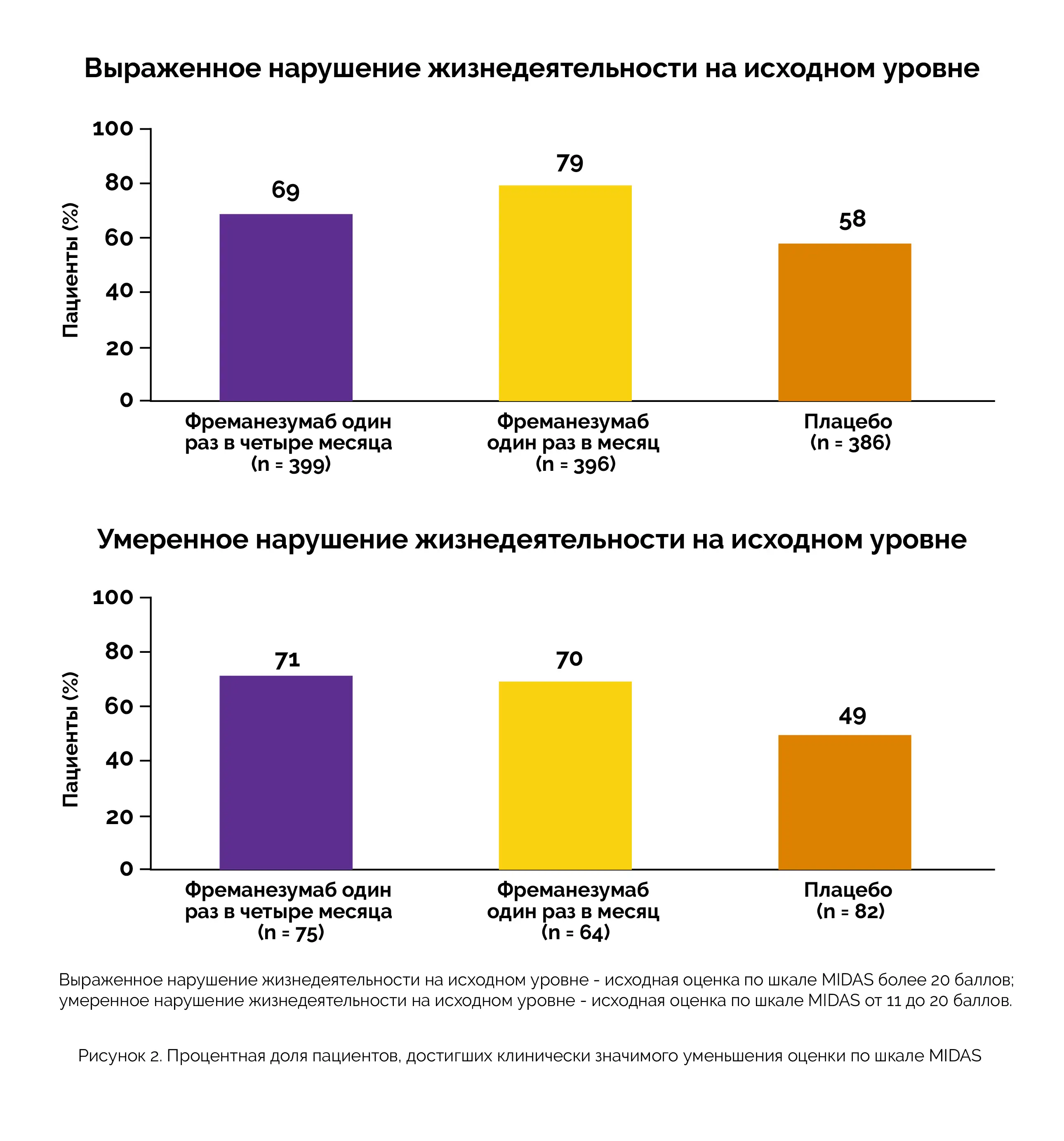 При применении фреманезумаба один раз в месяц или один раз в четыре месяца доля пациентов, достигших уменьшения тяжести нарушения жизнедеятельности на 1–3 степени согласно оценкам по опроснику HIT-6 или шкале MIDAS, была статистически значимо выше по сравнению с группой плацебо.
