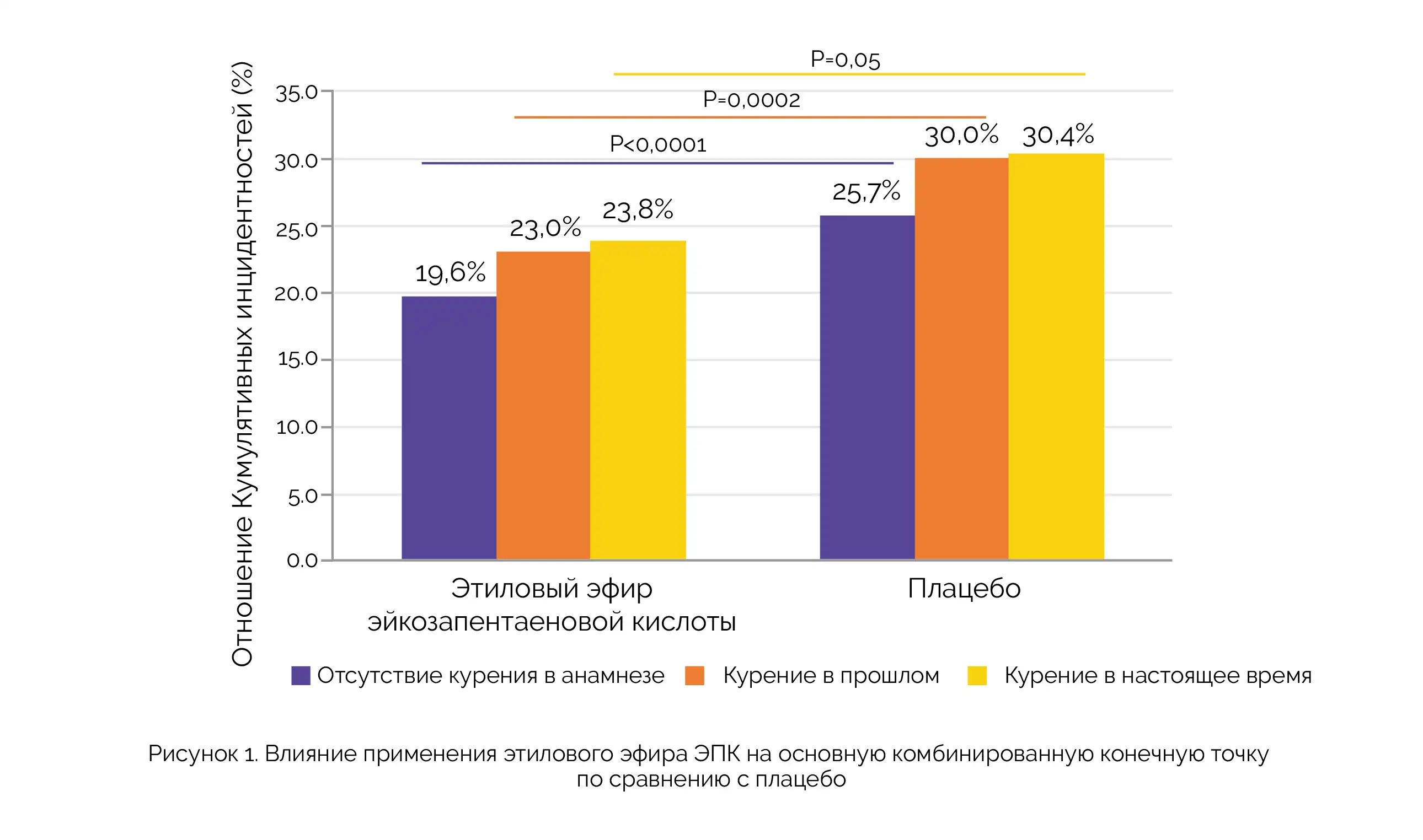 Эти благоприятные эффекты сохранялись и при анализе в подгруппах с учетом анамнеза курения (курение в настоящее время и в прошлом). Кроме того, было отмечено снижение наступления дополнительной конечной точки и отдельных компонентов основной комбинированной конечной точки («смерть от ССЗ или несмертельный ИМ» и «смертельных или несмертельный ИМ»). У некурящих пациентов эти благоприятные эффекты также присутствовали и были статистически значимыми. Ожидаемая частота первого наступления основных конечных точек, относящихся к ССЗ, у курильщиков (23,8 %) и бывших курильщиков (23,0 %), распределенных в группу применения этилового эфира ЭПК, была сопоставимой с показателями у некурящих пациентов, распределенных в группу плацебо (25,7 %) (см. рисунок 1).