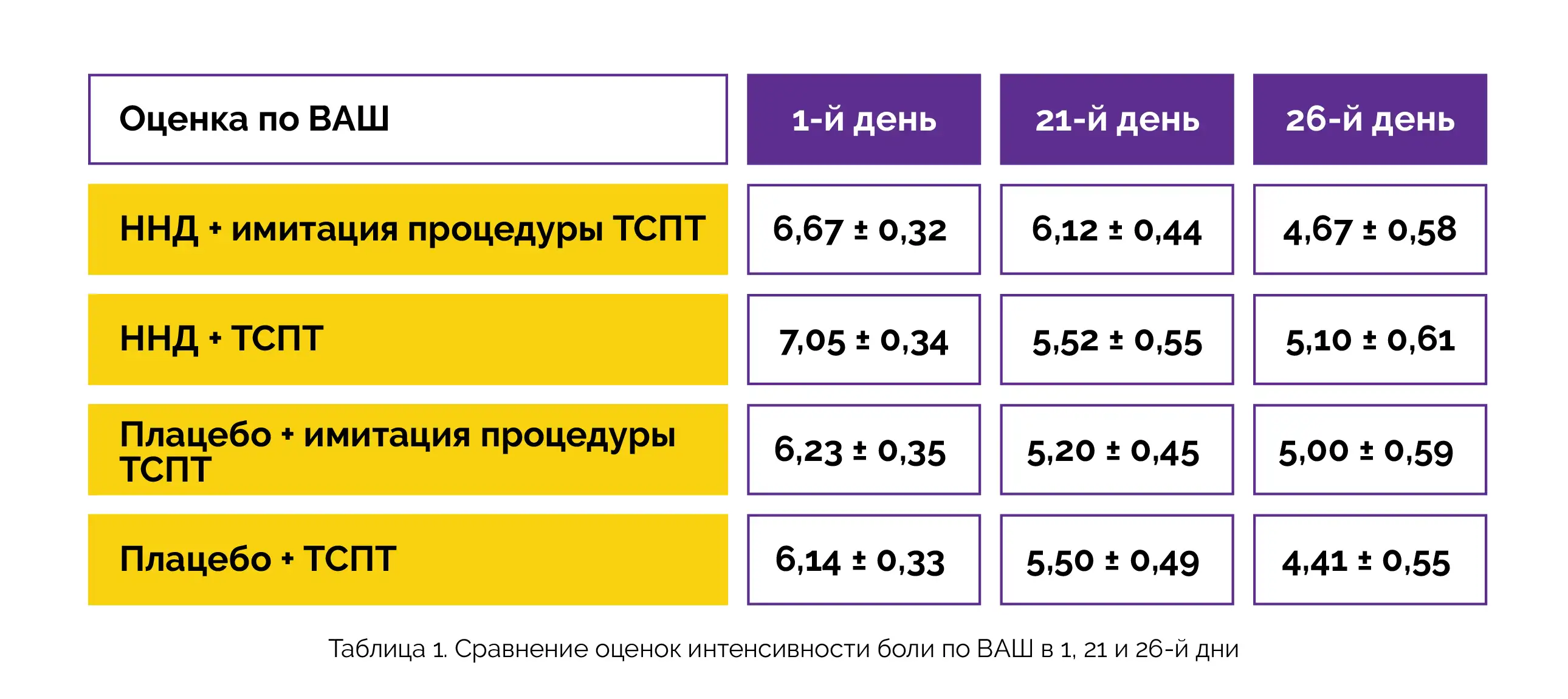 На исходном уровне значения всех показателей в группах лечения были сопоставимы. В группах применения ННД + ТСПТ, ННД + имитация процедуры ТСПТ и плацебо + имитация процедуры ТСПТ было отмечено статистически значимое снижение оценок интенсивности боли по ВАШ (см. таблицу 1).